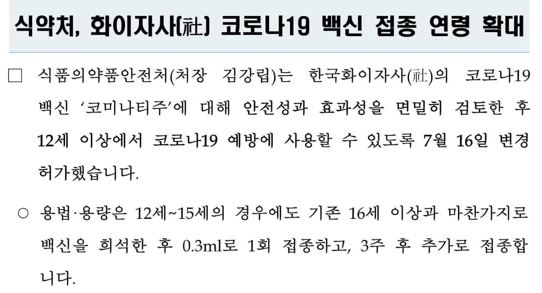 화이자는 허가보고서에 만 16세 이상을 대상으로 허가 요청 했고, 21년 3월 식약처는 만 16세 이상으로 허가 후 7월 만 12세 이상으로 허가 변경 했다.