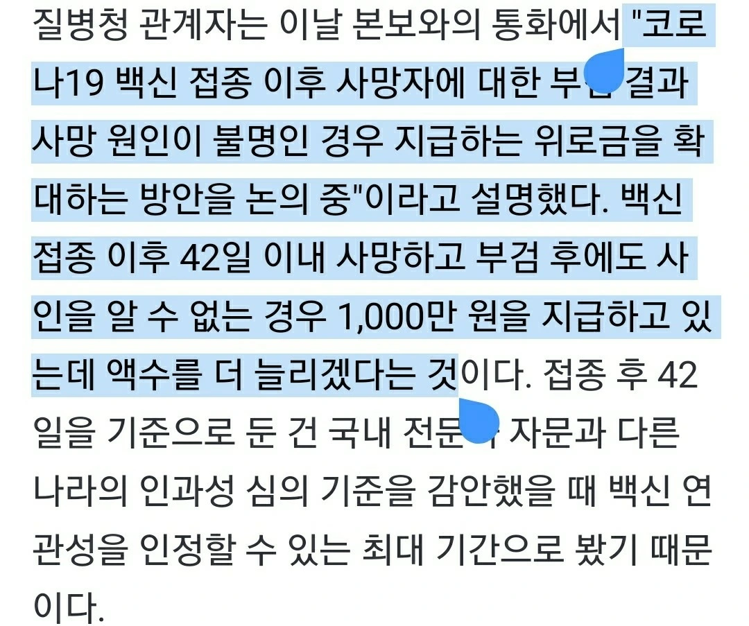 돌연사 후 부검에서 사인불명 시 1천만 원 지급하면 접종률이 높아질 거라는 질병청 기사