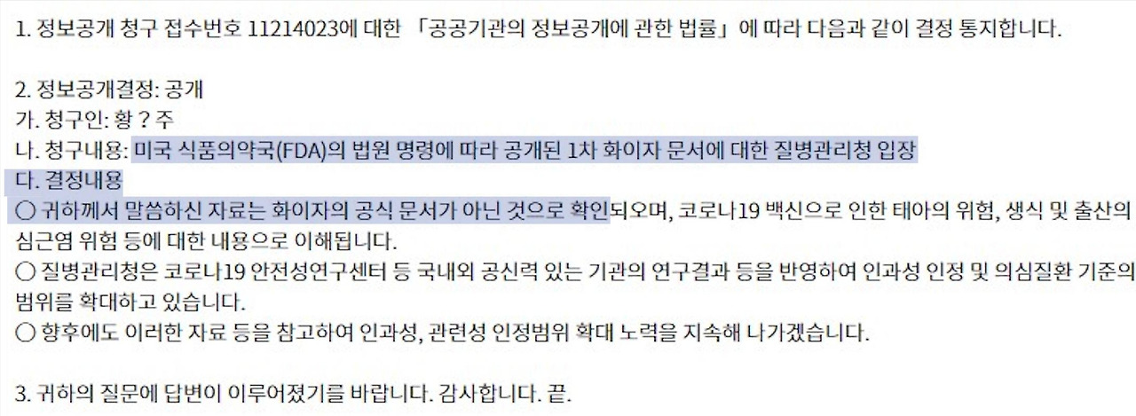 미법원 명령으로 공개된 화이자 내부문서에 대한 질병청 답변