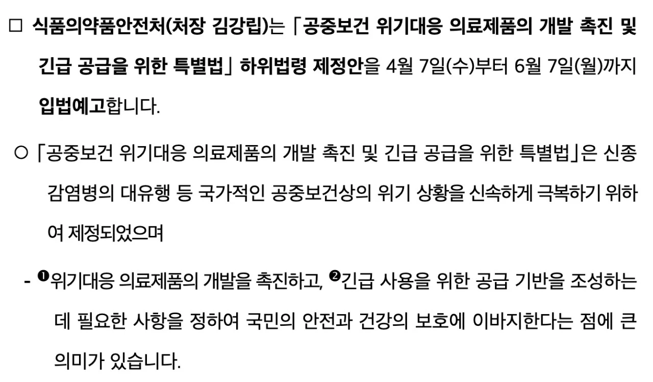• 식약처 답변 : [공중보건 위기대응 의료제품의 개발 촉진 및 긴급 공급을 위한 특별법] 및 질병청의 요청에 따라 긴급 사용 승인함