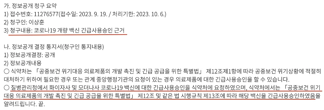 긴급승인 근거에 대한 식약처 답변