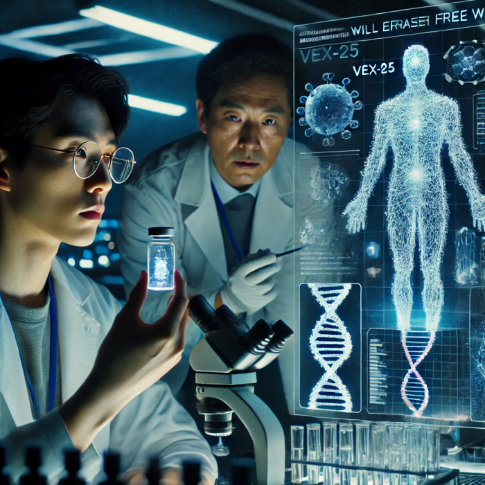 이민석 박사와 최준혁 연구원은 연구실에서 VEX-25의 마지막 테스트를 진행하며, 나노봇이 신경계를 완벽하게 장악할 수 있도록 세밀하게 조정하고 있었다. 이민석 박사의 팀 역시 연구가 거의 완성 단계에 이르렀음에도 불구하고, 부작용 문제를 해결하지 못했다. 크로노스 바이러스처럼 인간 DNA를 직접 변형하는 과정에서 심각한 부작용이 계속해서 발생하고 있었다.