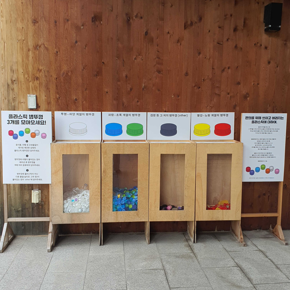 왼쪽: 배달로 발생하는 일회용품 쓰레기(ⓒ참여와 혁신) / 오른쪽: 소형플라스틱 '병뚜껑' 수거함(ⓒ슭)