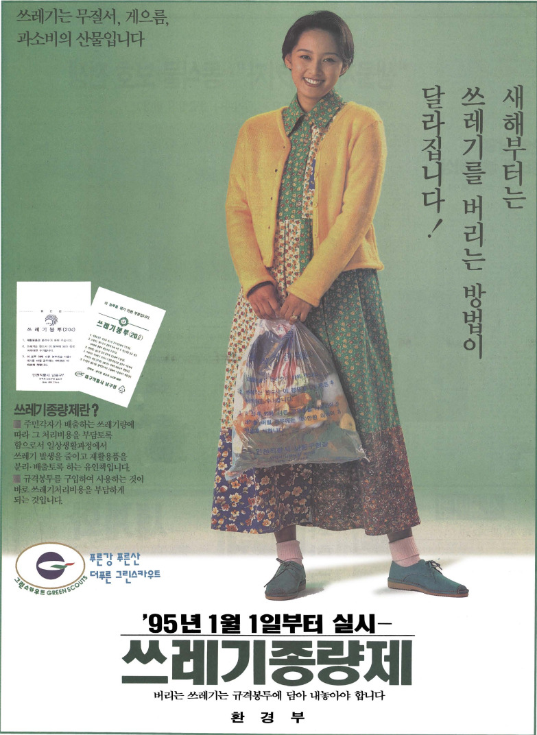1995년 1월 1일 전국적으로 쓰레기 종량제가 시작됐다. 정식 명칭으로는 '쓰레기 수수료 종량제'. 용어 그대로 쓰레기 배출 시 수수료를 발생시켜, 배출자가 직접 처리비용을 부담하게 함으로써 쓰레기 배출을 억제하려는 제도이다. 쓰레기의 배출량에 따라 차등적인 비용이 부과되고, 이것은 곧 종량제 봉투의 사이즈로 구분되었다. 버리기 위해 돈을 써야 하는 시대가 온 것이다.