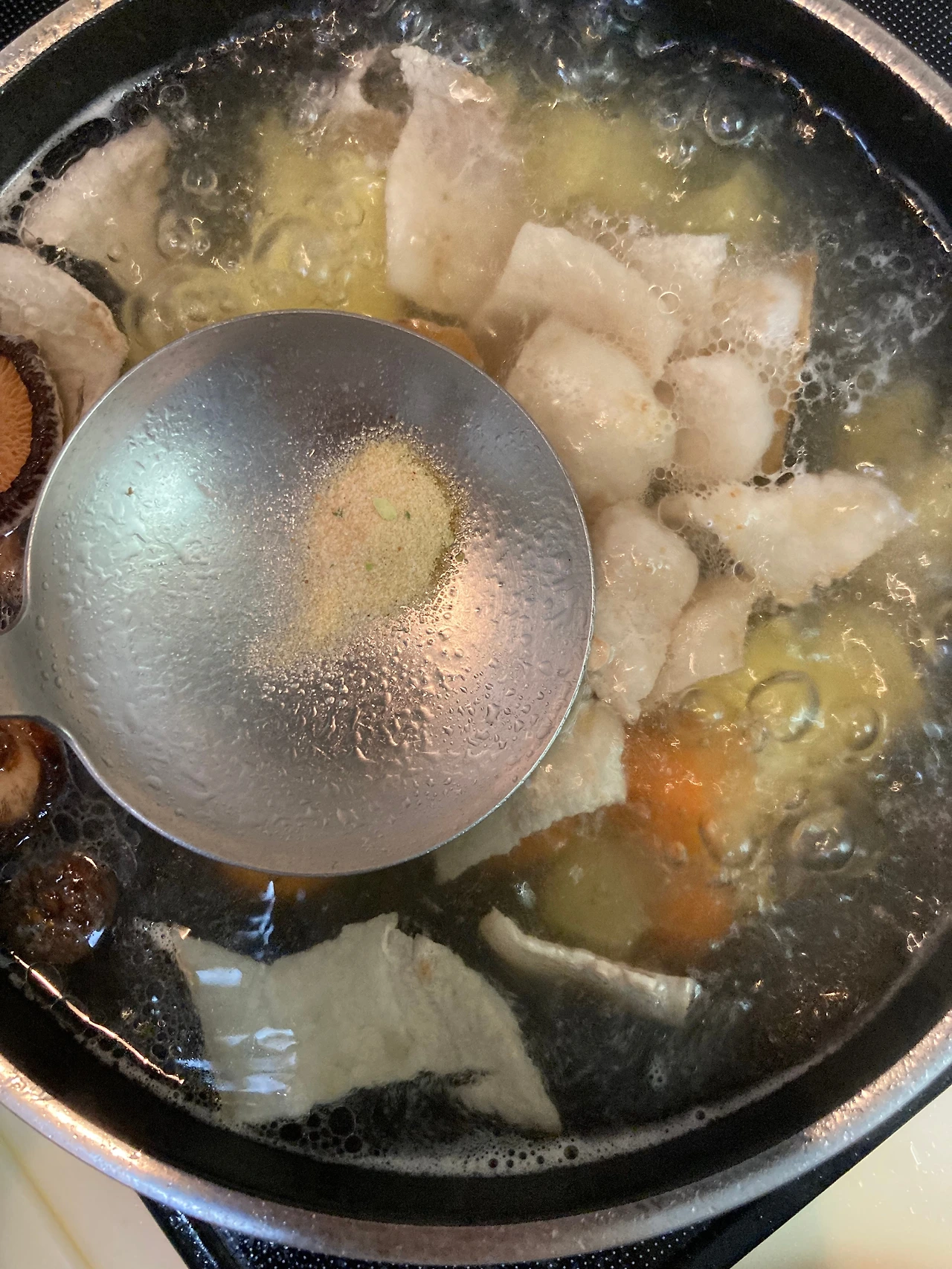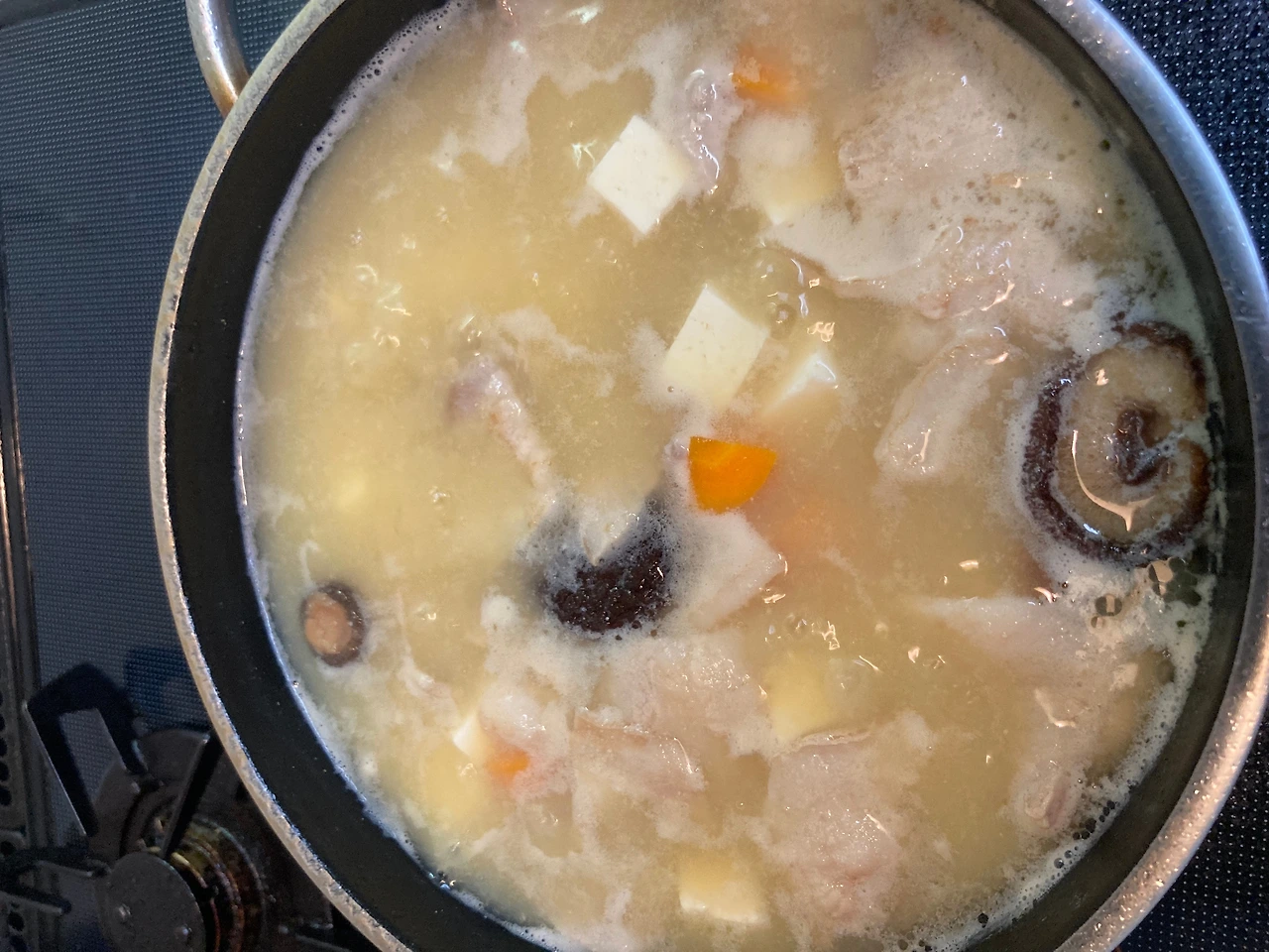 집에는 한국 된장 밖에 없어서 바로 미소(味噌)를 사 왔다. 책에서는 양파, 무, 당근, 감자, 두부, 고기를 몽땅 넣고 끓인 뒤 미소로 간을 맞췄지만 뭔가 더 맛있는 방법이 있을까 해서 인터넷을 검색한 뒤 곧 만들기에 돌입했다. 방법은 간단했다. 삼겹살을 살짝 구워서 기름을 빼주고, 말린 표고를 넣어 함께 육수를 끓이고 깊은 맛을 위해 우동스프도 넣어준다. 끓는 동안은 다른 채소(감자, 당근, 두부)를 손질한다.