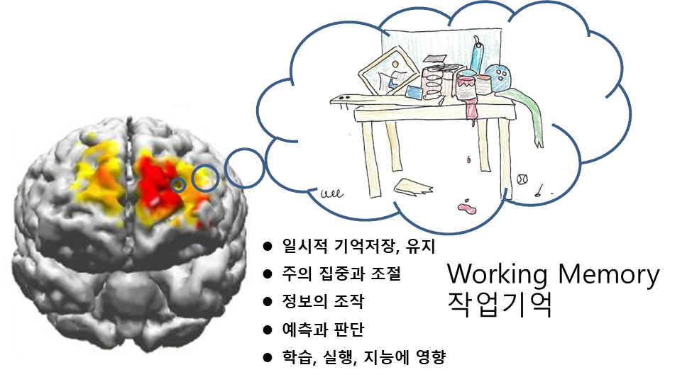 기억의 다중체계를 주장한 애트킨슨과 쉬프린(Atkinson & Shiffrin, 1968)은 기억을 감각기억, 작업기억, 장기기억으로 구분했습니다. 눈 여겨볼만한 것은 데이터의 흔적이 1초인 감각기억과 최대 수십년인 장기기억 사이, 작업기억입니다. 정보들을 바탕으로 생각하고 판단하는 전두엽 중에서 배외측 전전두엽(PFC)이 작업기억을 관장합니다. 여기는 컴퓨터 램RAM과 비슷하게 다양한 정보처리가 일어납니다. 시각, 청각, 언어, 의미, 정서 등의 각종 정보가 연결되고 통합이 이루어집니다. 이렇게 인지적 처리를 전개하는 이 작업 마당은 저장 용량의 제한이 있습니다. 통상 5개부터 9개의 정보가 한계이죠. 또한, 이 배외측 전전두엽은 생각을 조율할 뿐만이 아니라 감정까지도 조절합니다. PFC가 망가지면 감정들의 통제가 어려워지고 주의집중에 문제가 생깁니다. 인지적 처리가 이루어지는 작업기억에도 나쁘겠죠.