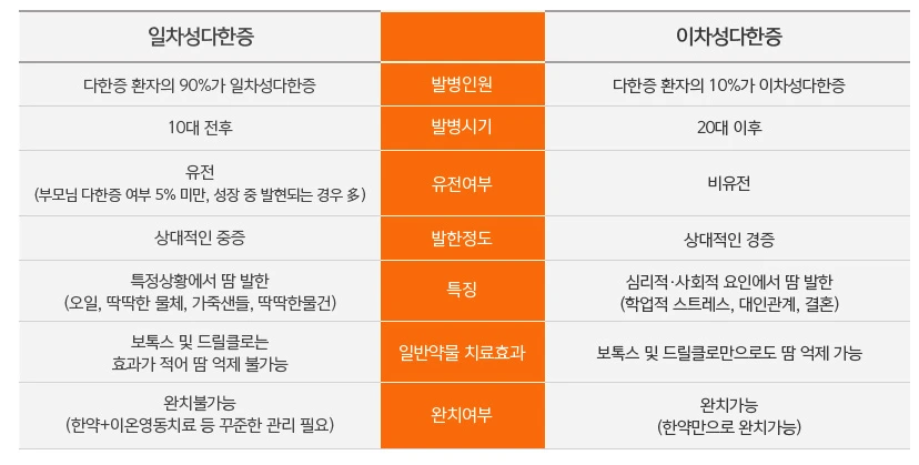 다한증은 신체의 정상적 생리상태에 비해 필요 이상의 과도한 땀이 분비되는 질환이다. 땀 분비 부위에 따른 국소적 다한증, 전신적 다한증으로 분류할 수 있다. 원인 유무에 따른 일차성, 이차성 다한증으로도 분류가 가능하다. 다한증은 지나친 땀 배출로 인해 생활 속 불편함을 비롯해 신체적 고통 및 심리 상태에 영향을 준다.