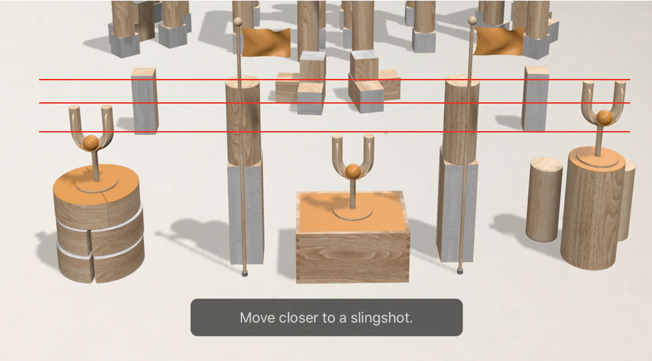 Swift Shot 게임 중 플레이어가 공격을 시도할 때 블럭 방해물들이 길목에 놓여있어 적의 블럭을 쉽게 쓰러뜨리는 각도를 찾기가 어렵습니다. 자세히 보시면 알겠지만, 세 개의 Slingshot 높이가 모두 다릅니다. 플레이를 하면서 자연스럽게 플레이어는 더 좋은 각도가 발생하는 SlingShot으로 이리저리 옮겨 다니게 됩니다. 이는 사용자들의 환경을 고려하여 사용자의 움직임을 유도해내고 게임의 몰입감과 활동성을 높인 한가지 방법입니다.