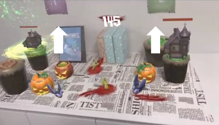 앞서 말했듯 2D 환경에 익숙한 사용자들에게 처음 경험하는 AR환경을 자연스럽게 적응하게 하기 위해서는 디바이스를 움직일 수 있도록 유도하는 Nudging이 필요합니다. 바로 거리와 높이 차이죠. 게임 화면 사진을 보시면 전체적으로 땅의 게임 플레이 영역과 하늘의 플레이어 구분 영역으로 나누어집니다. 플레이어 구분을 위해 만든 하늘의 해골 깃발 콘텐츠를 Nudging용으로 이용했습니다.