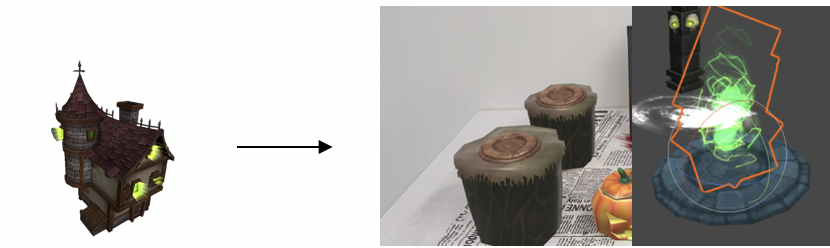SwiftShot에서 게임 보드를 증강 시킬 때 Indicator가 사용 됐다면, GhostSLAM은 타워를 배치할 때 3D 콘텐츠로 된 Indicator가 사용됩니다. 게임이기 때문에 가장 오른쪽 사진처럼 Indicator에서 3D 파티클 효과가 나타나며 사용자에게 배치가 활성화 되었다는 노티를 제공하게 됩니다.