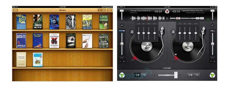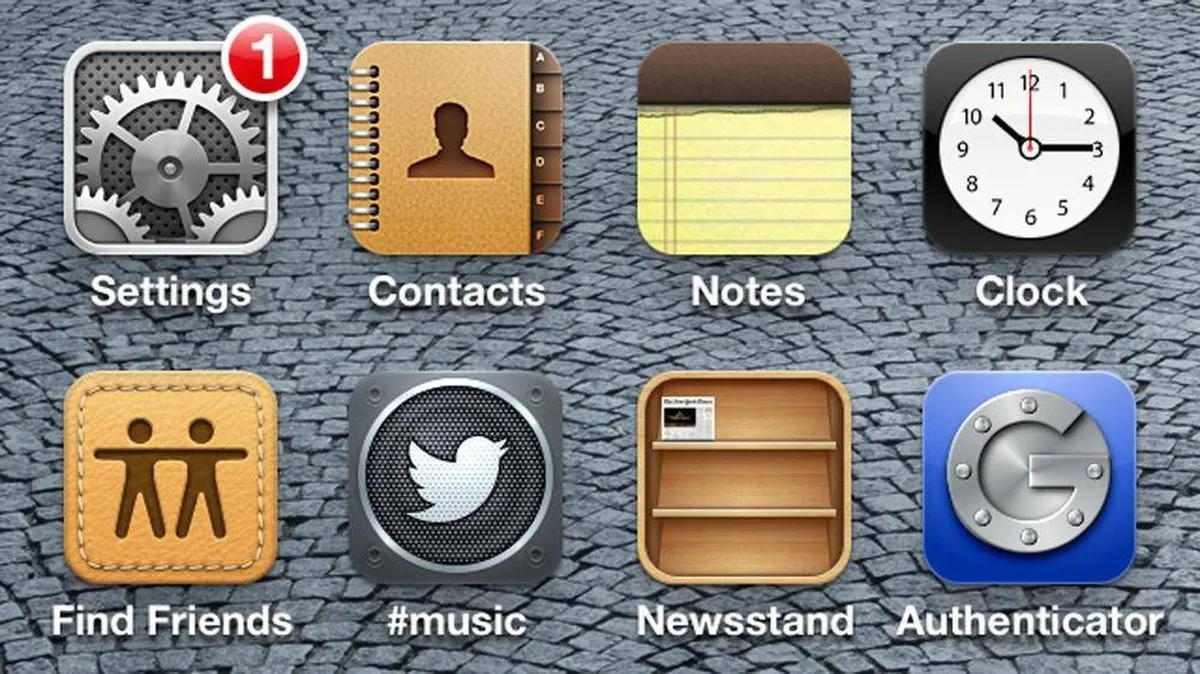 바로 아날로그에서 경험하던 것들을 디지털에서도 동일하게 경험할 수 있도록 하는 Skeuomorphic(스큐어모피즘) 덕분이었습니다. Skeuomorphic(스큐어모피즘)은 그리스어로 도구를 뜻하는 Skeuos와 형태를 뜻하는 morphe의 합성어로 사물의 형태를 있는 그대로 표현하는 그래픽 양식입니다. 사진과 같이 아날로그의 사물을 디지털로 옮겨온 그래픽으로 다른 말로는 리얼리즘 메타포로도 불립니다. 2007년 첫 아이폰부터 ios6까지 Apple의 오래된 그래픽 아이덴티티이기도 했죠.