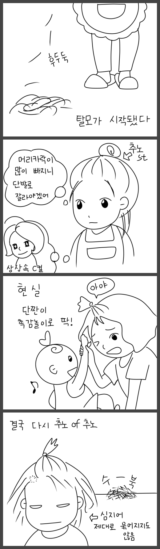 출산 후 탈모증상이 없었기에 다들 심각한 표정으로 해주었던 그 말을 잊고 있었다. 가끔 탈모에 관한 생각이 올라올 때면, 탈모가 나를 피해가나? 하는 안일한 생각을 했다. 그러나 피해가기는 개뿔, 탈모는 출산 후 100일부터가 고비라고 한다. 나도 아기의 백일 무렵과 함께 빗으로 빗기만 해도 떨어져 내리는 머리카락을 발견했다. 아기가 눕는 곳에도, 아기가 빨아대는 공갈젖꼭지 위에도, 화장실은 물론이고 어딜 가나 내 머리카락이 보인다. (남편은 그런 나에게 화장실에서만 머리를 빗으라고 잔소리를 한다.)