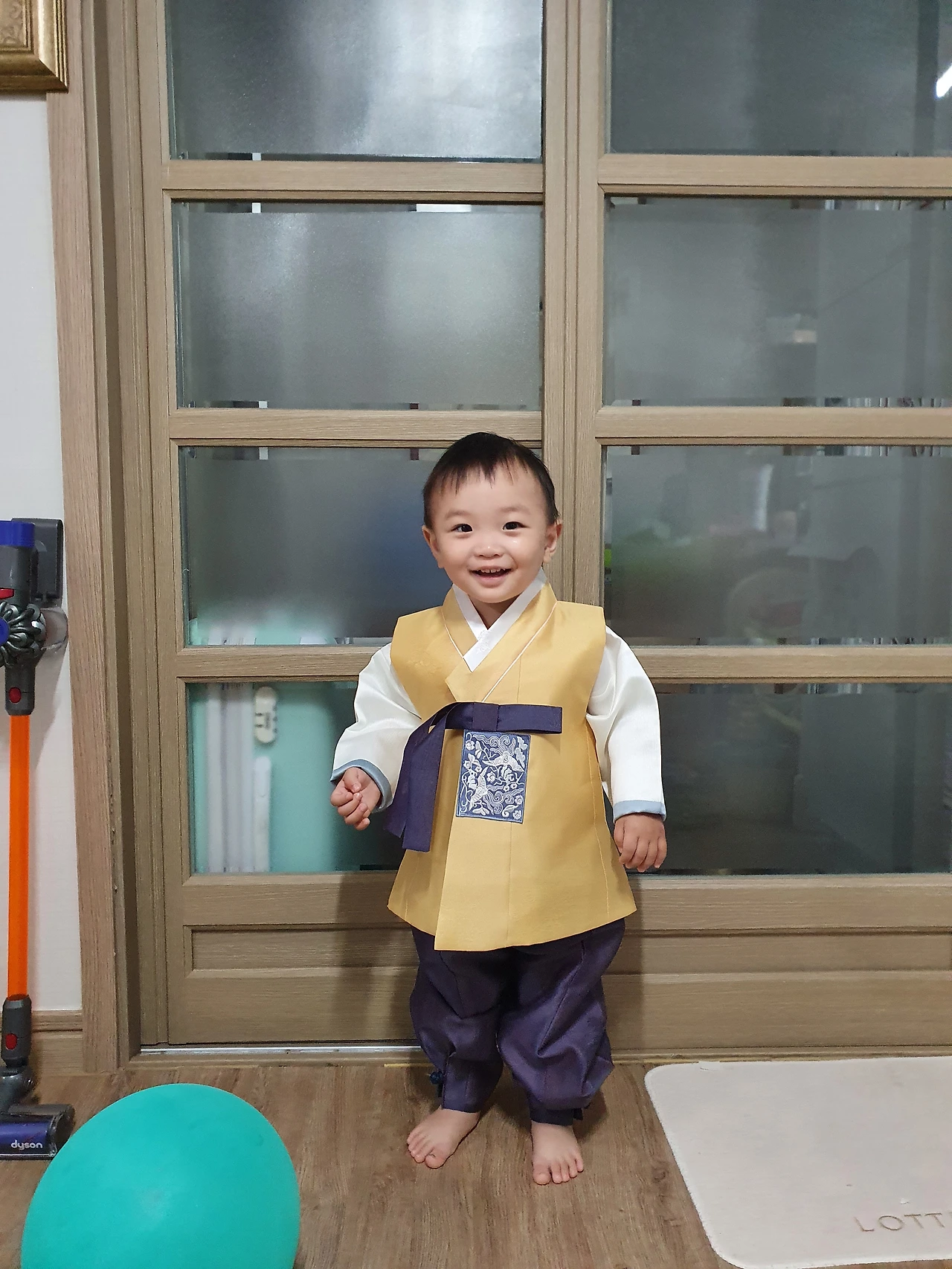 아기는 유독 노란색과 머스터드색이 잘 어울려서 인디핑크나 하늘색, 남색 한복을 어깨에 대어 볼 때와 노랑을 대어 볼 때 얼굴빛이 달라진다.