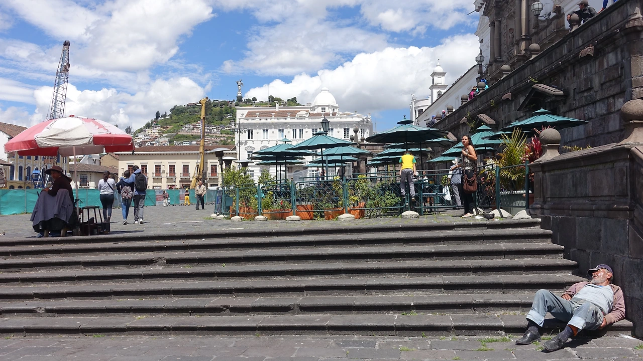 마지막으로 들른 곳은 산 프란치스코 수도원이었다. 이 랜드마크 앞은 하필 공사가 한창이었다. 정면에 서서 사진을 한 장 찍고 싶었는데 도무지 각이 나오지 않았다. 공사로 가뜩이나 어수선한 수도원 앞에는 한 노인이 모로 누워있었다. 그는 오가는 관광객들을 아랑곳하지 않고 계단에 기대 오수를 즐기는 중이었다. 행색은 조금 남루했으나 평안한 표정이었다. 그의 얼굴 위로도 다른 모두에게처럼 태양이 쏟아지고 있었다. 수많은 사람들이 오갔지만 그에게 신경 쓰는 이는 없었다. 평화롭고 쓸쓸한 장면이라 눈길을 떼기가 힘이 들었다. 키토의 끝인상이었다.