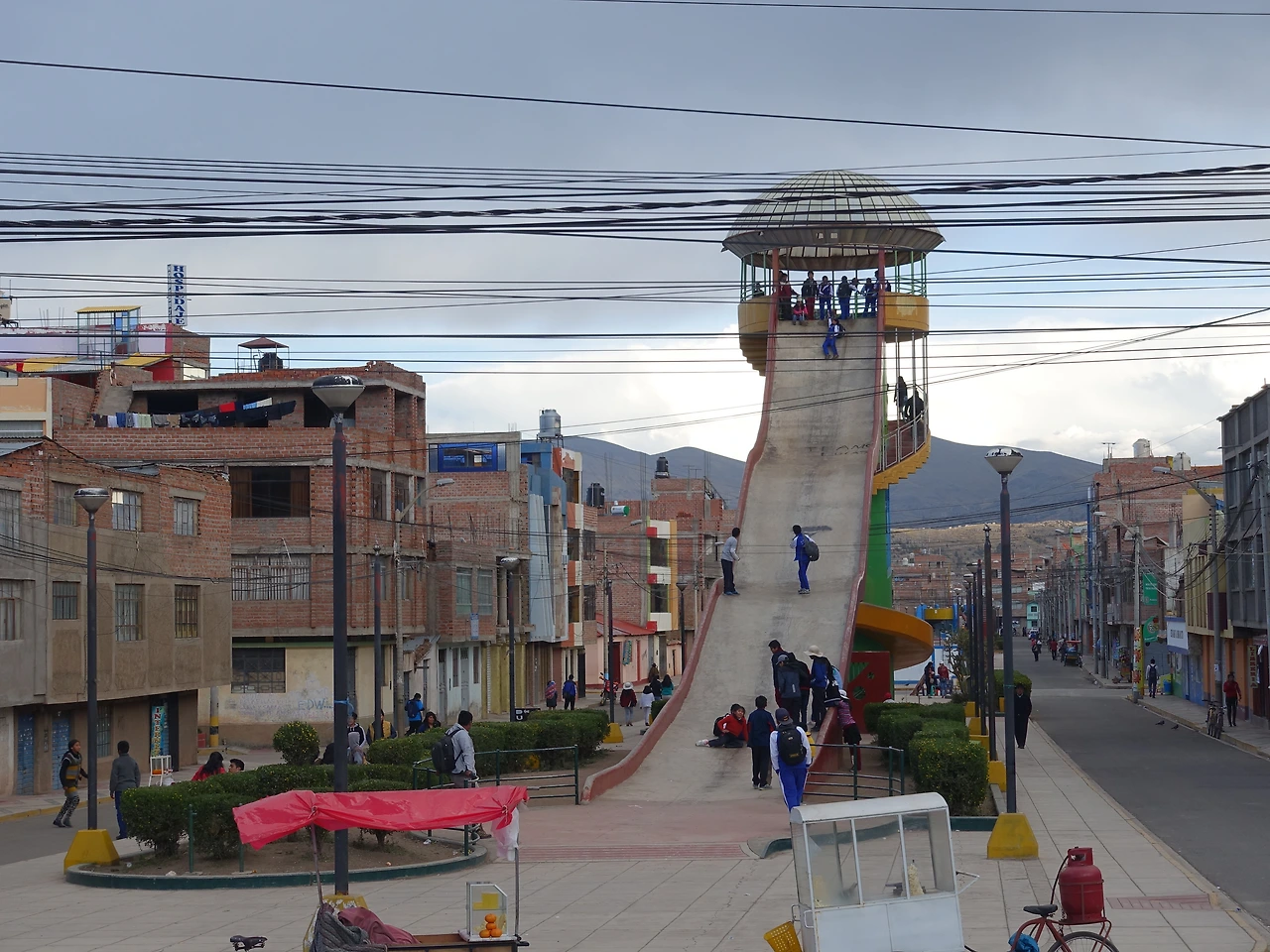 조금은 남루해 보이는 골목을 따라 5분쯤 걷자 광장이 나왔다. 광장이 있는 중심가는 관광지 같기도 하고 여느 시골의 읍내 같기도 한 독특한 분위기를 풍겼다. 한동안 머물렀던 쿠스코는 너무나 관광지 같은 곳이었는데 상대적으로 푸노에선 현지인들의 일상을 느낄 수 있었다. 학교에 갔다가 돌아오는 학생들, 광장을 지키는 경찰들, 길거리 음식을 파는 노점상들, 나름의 대형 마트, 거리 한가운데 놓인 대형 미끄럼틀에서 교복을 입고 미끄럼틀을 타는 아이들, 해질녘 티티카카 호숫가를 거니는 젊은 연인들. 오랜만에 만나는 듯한 남들의 '일상'이 묘하게 편안한 기분을 불러다 주었다.