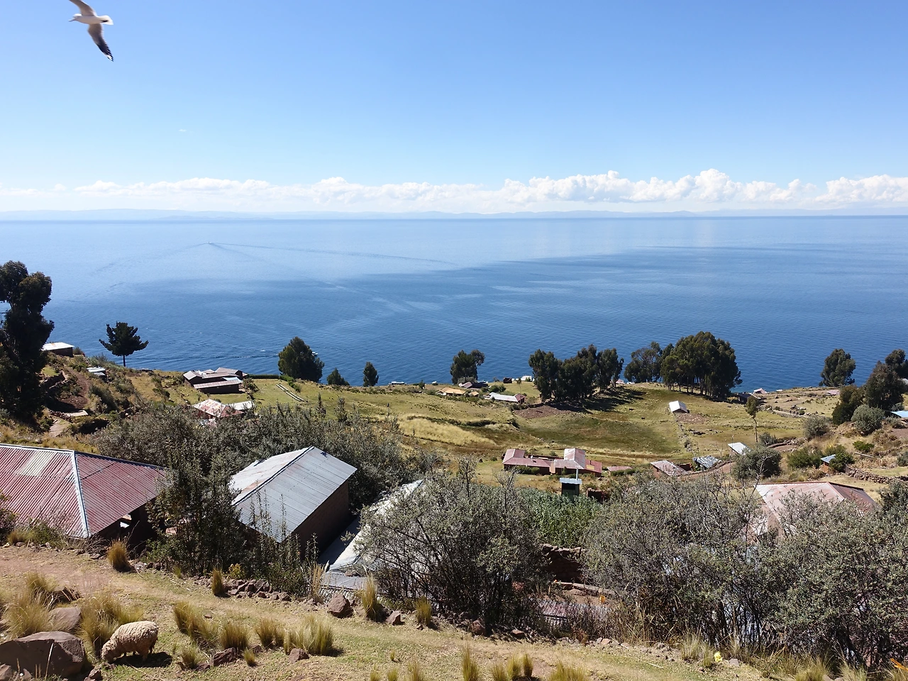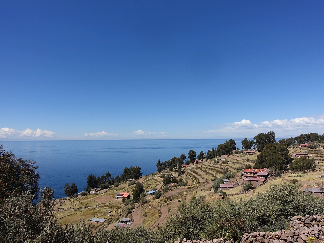 죽을 고비를 넘겨서 도착한 광장에서 아래를 내려다보니 찬란한 파란색에 눈이 아려왔다. 하늘과 물의 경계가 구름이 아니었다면 가려지지 않았을까 싶을 정도로 온통 파란색이었다. 계단식 논밭과 사이에는 작은 성냥갑처럼 집들이 박혀있었다. 조금 더 조용하고 한적한 남해 다랭이마을을 보는 것 같았다. 제주도보다도 작은 이 섬의 마을들은 잉카 시절처럼 공동생산, 공동분배 방식으로 살아나간다. 스페인 식민지 시절에는 교도소로 쓰였다던데, 교도소로 쓰이기엔 너무나 아름다운 곳이었다.