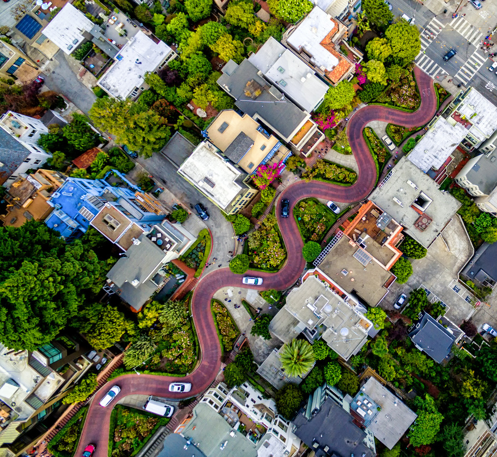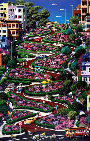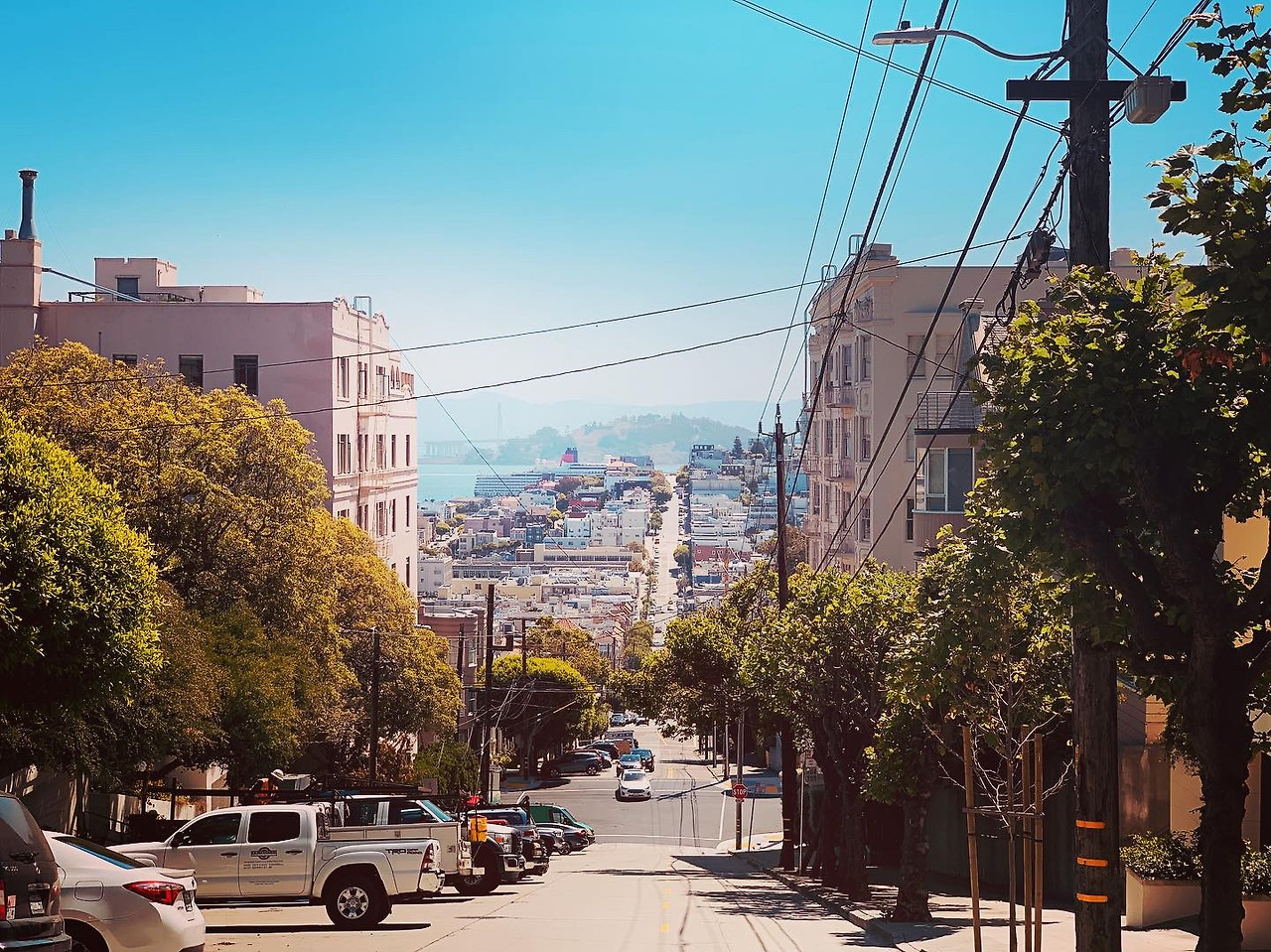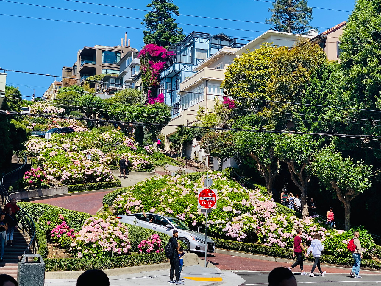 영화에 나오는 샌프란시스코의 구불구불한 언덕길, 롬바드 스트리트 (Lombard St.) 러시안 힐 (Russian Hill). 사실은 이 장소가 나의 메인 목적지였다. 시간의 제약 때문에 언덕 밑에서 바라볼 시간밖에 없었던 나에게, 여기저기 오르락내리락하면서 내가 원하는 구도로 사진을 찍을 시간은 없었다. 그래도 길 따라 나 있는 꽃들은 알록달록 너무 이뻤고, 마침 길 따라 내려오는 차들이 있어서 그래도 만족스러운 구경이었다.