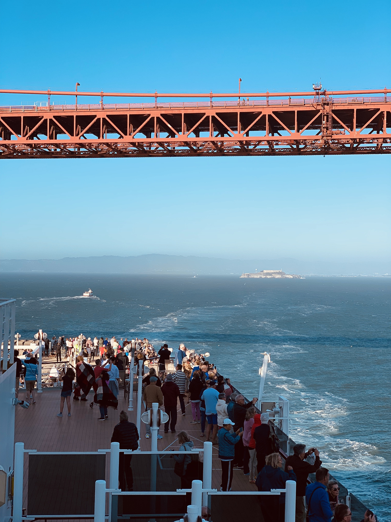 샌프란시스코 항구에 정박해있는 퀸 엘리자베스가 바다를 향해 다시금 항해를 시작하는 바로 그 순간. 그것도 금문교 (Golden Gate Bridge) 밑을 지나가고, 알카트라즈 섬 (Alcatraz Island) 을 지나가는 그 세일 어웨이. 바로 이 날의 진짜 하이라이트다.