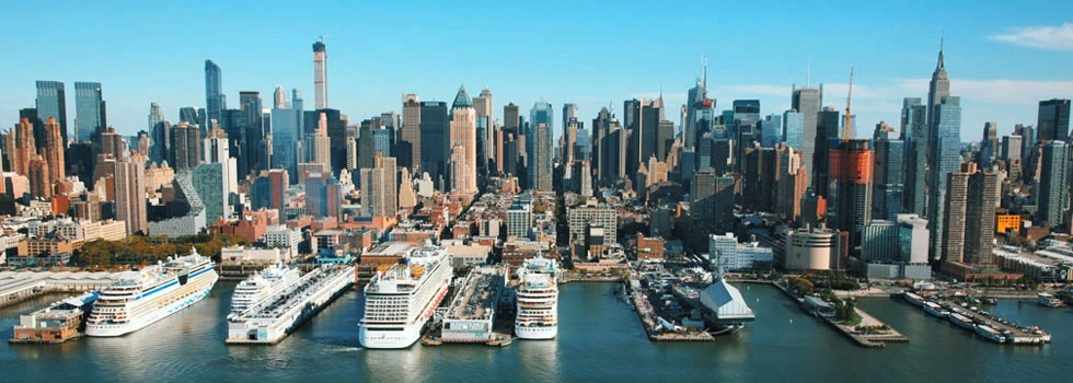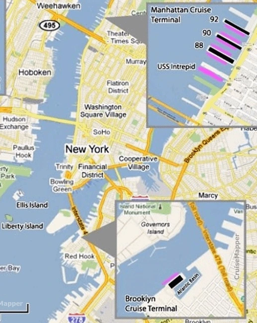 뉴욕에는 맨해튼 크루즈 터미널 (Manhattan Cruise Terminal) 과 브루클린 크루즈 터미널 (Brooklyn Cruise Terminal), 두 개의 크루즈 터미널이 있다. 그중 퀸 엘리자베스가 정박한 항구는 맨해튼 크루즈 터미널 중에서도 선착장 90 (Pier 90) 이었다.