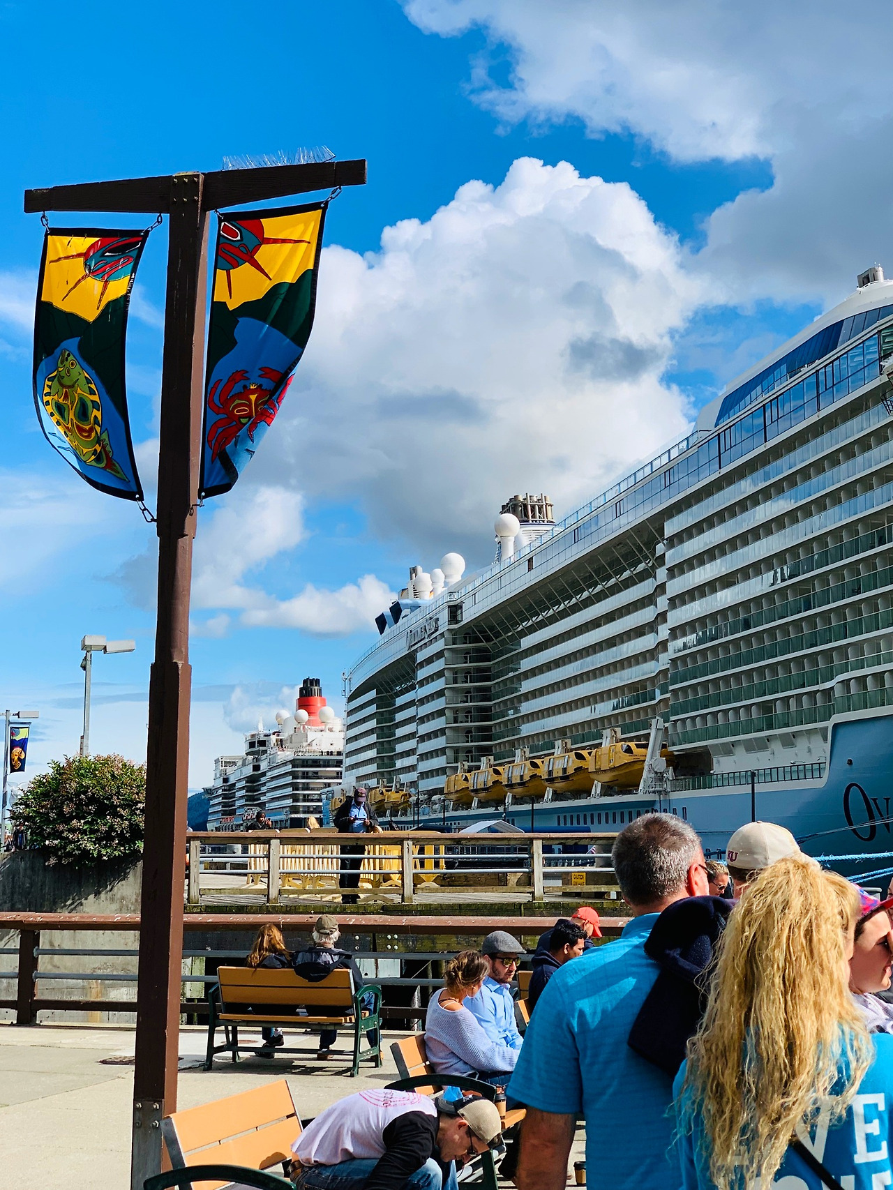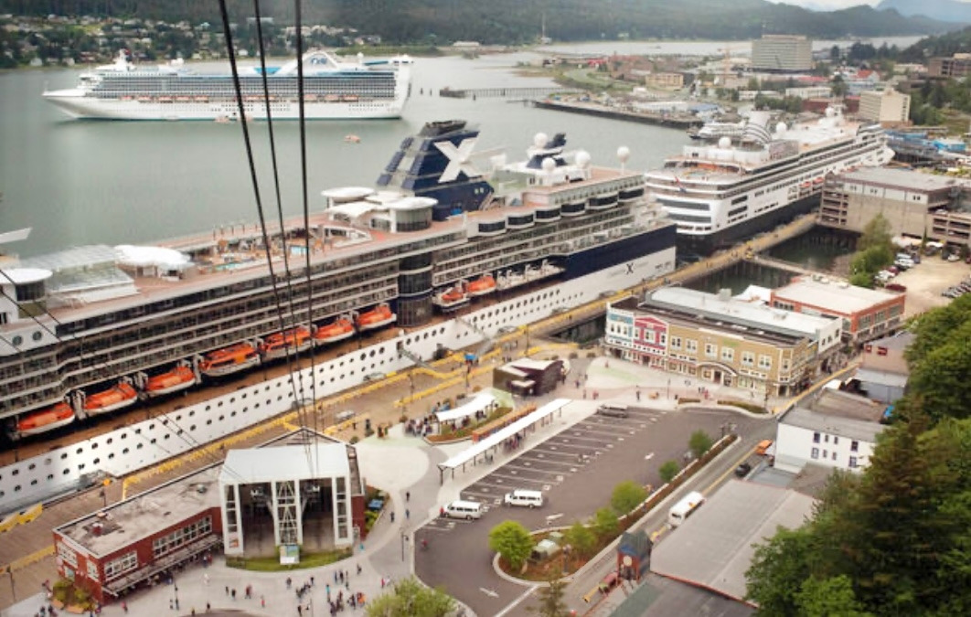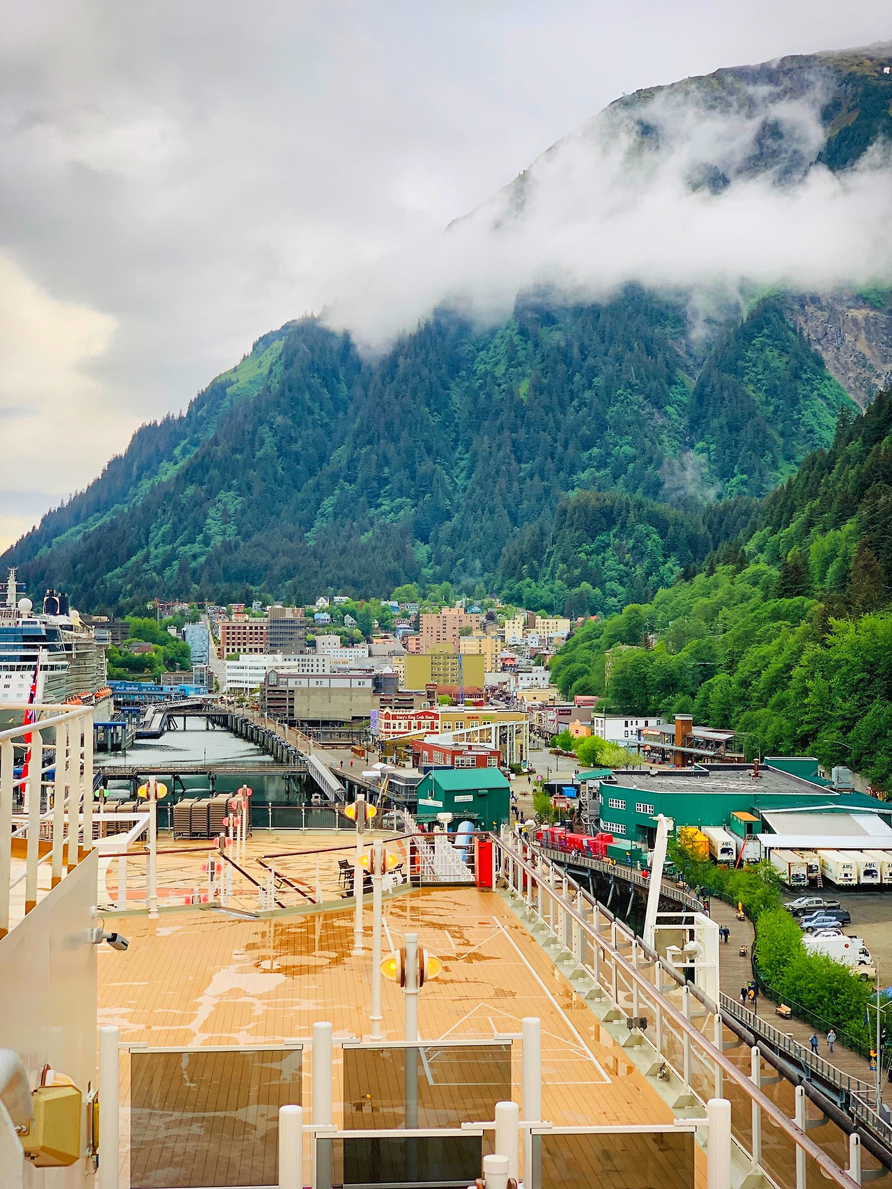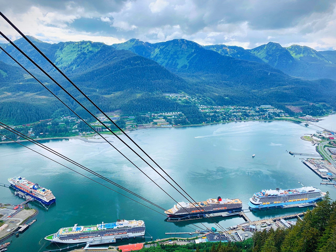 퀸 엘리자베스호가 가스티노 해협 (Gastineau Channel)으로 들어섰다. 안쪽으로 들어가면 산 밑의 오밀조밀한 마을, 빨간 곤돌라, 그리고 먼저 도착해 있는 크루즈선들이 우리를 반겨 주었다.