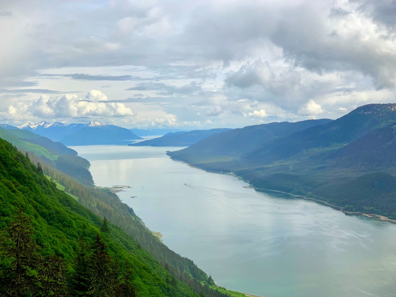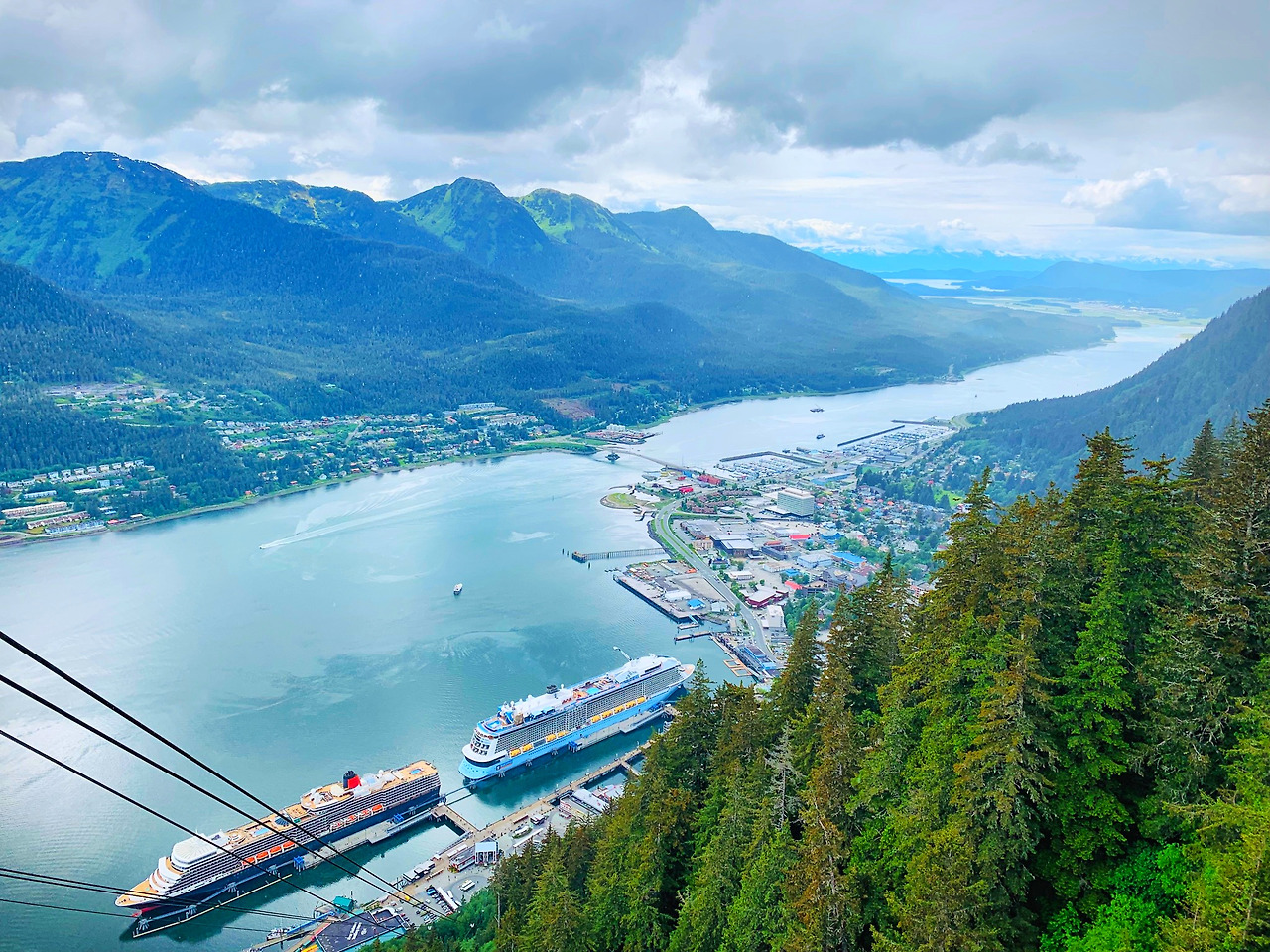 길게 빠져있는 해협, 늘어져 있는 산에 군데군데 보이는 눈, 산끝자락에 붙어 항구와 인접에 있는 작은 마을, 그 마을을 먹여 살리겠구나 싶은 커다란 크루즈선. 모든 게 발아래에서 한눈에 보이는 것이 주노에서만 볼 수 있는 광경이다.