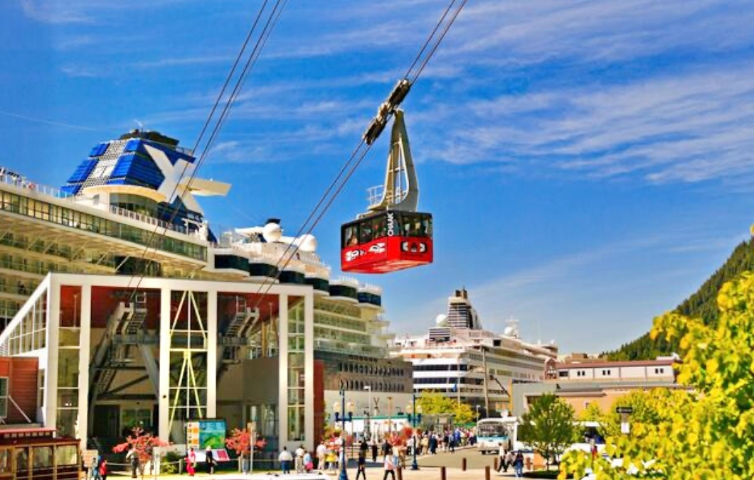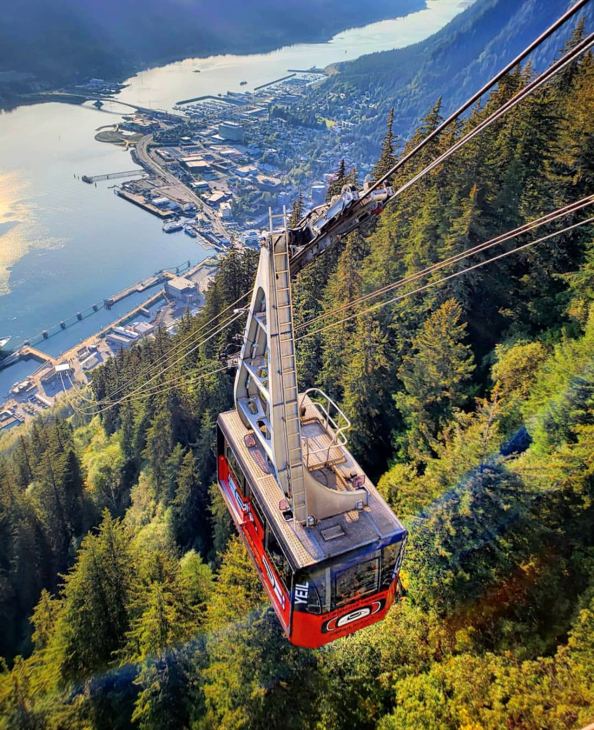 우선은 주노의 시그니쳐 빨간 곤돌라로 향했다. 골드벨트 트램 (Goldbelt Tram)이라고 부르는데 공식 명칭은 마운트 로버츠 트램웨이 (Mount Roberts Tramway)로, 1164미터 높이의 산을 5분 만에 올라가는 공중트램이다. 표는 4만 원 정도로 한 번에 60명 정도까지 탈 수 있는 꽤나 커다란 곤돌라이다.