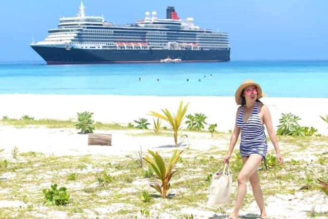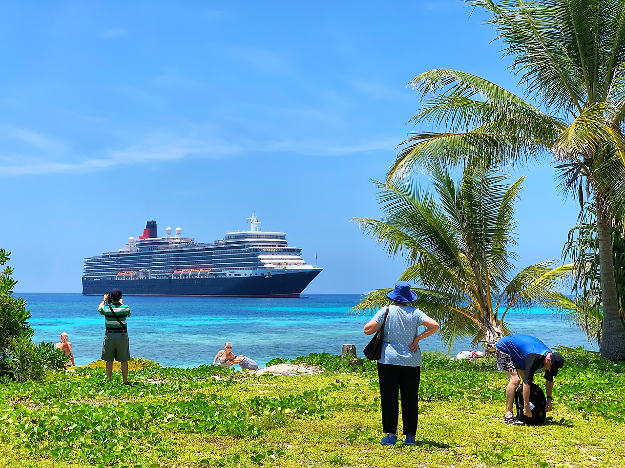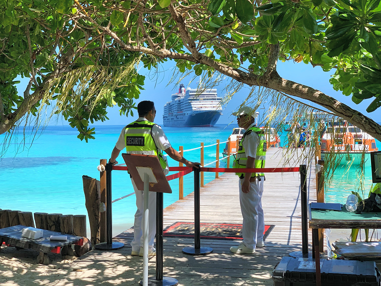 바다에 접한 작은 섬이기 때문에 품체가 큰 퀸 엘리자베스는 멀직히 바닷속에 닻을 내리고 작은 구명보트로 섬까지 이동하는 텐더링 포트였다. 기항지에서 즐길 수 있는 시간이 항상 제한적인 크루즈 승무원에게 솔직히 텐더링은 반갑지 않다. 하지만 이 섬에서 만큼은 수정 같은 바다 위의 우아한 엘리자베스 모습이 잊을 수 없는 그림 같은 추억을 선사했다.