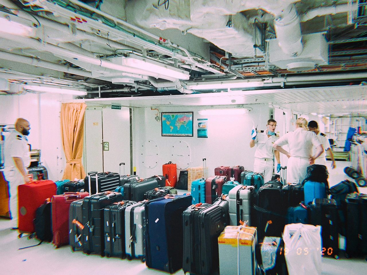 2개의 수트 케이스와 큰 배낭을 맨 크루에게