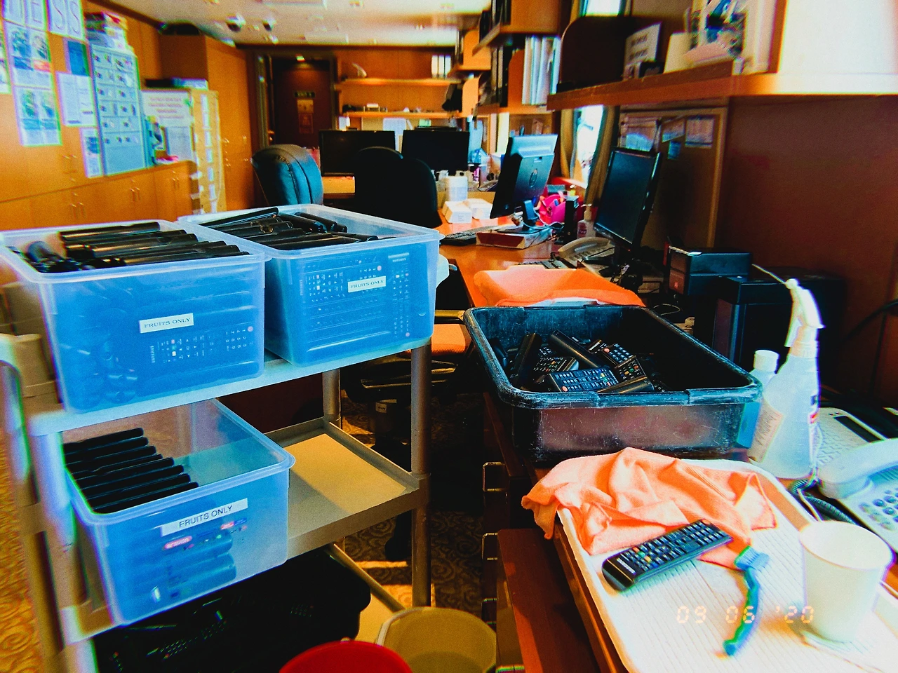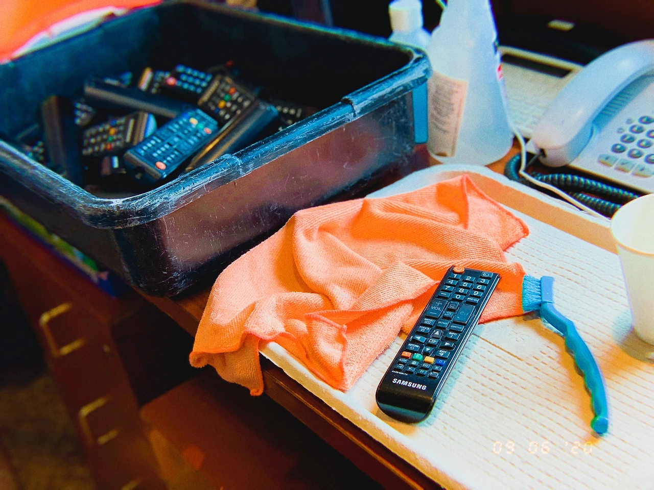 객실의 TV 리모콘 수백 개를 가지고 왔다.