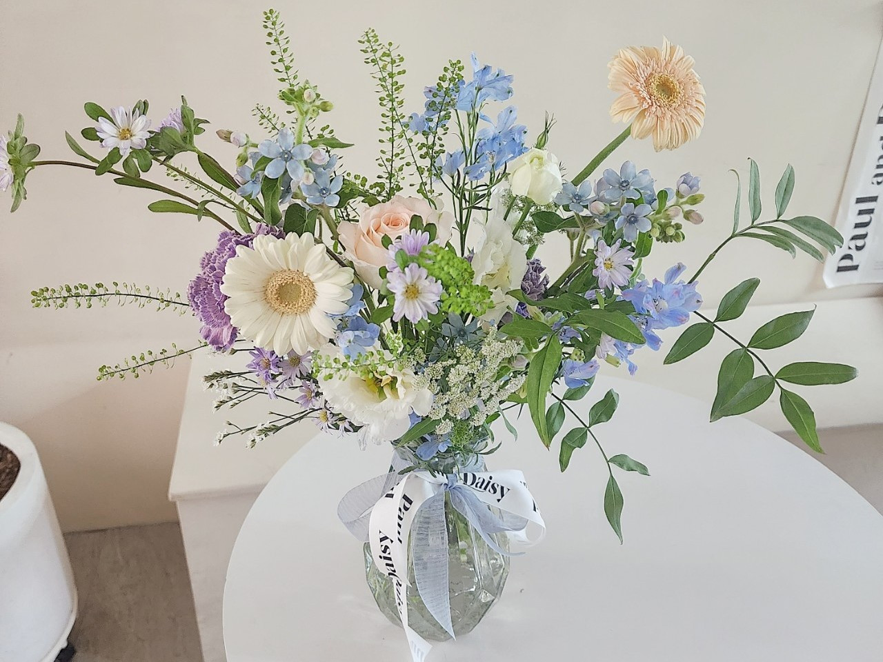 연두색 빛이 도는 묘한 흰색의 리시안셔스와 연분홍색의 거베라가 제일 먼저 눈에 들어왔다.