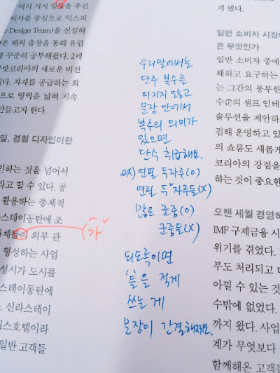 마지막으로, 제가 사회초년생 때 교정교열 선생님께 피드백 받은 대지 한 면을 소개합니다. 이렇게 기록한 수백 장의 대지 덕분에 지금 이렇게 잘난 척하며 글을 쓸 수 있음에 감사 인사드립니다.
