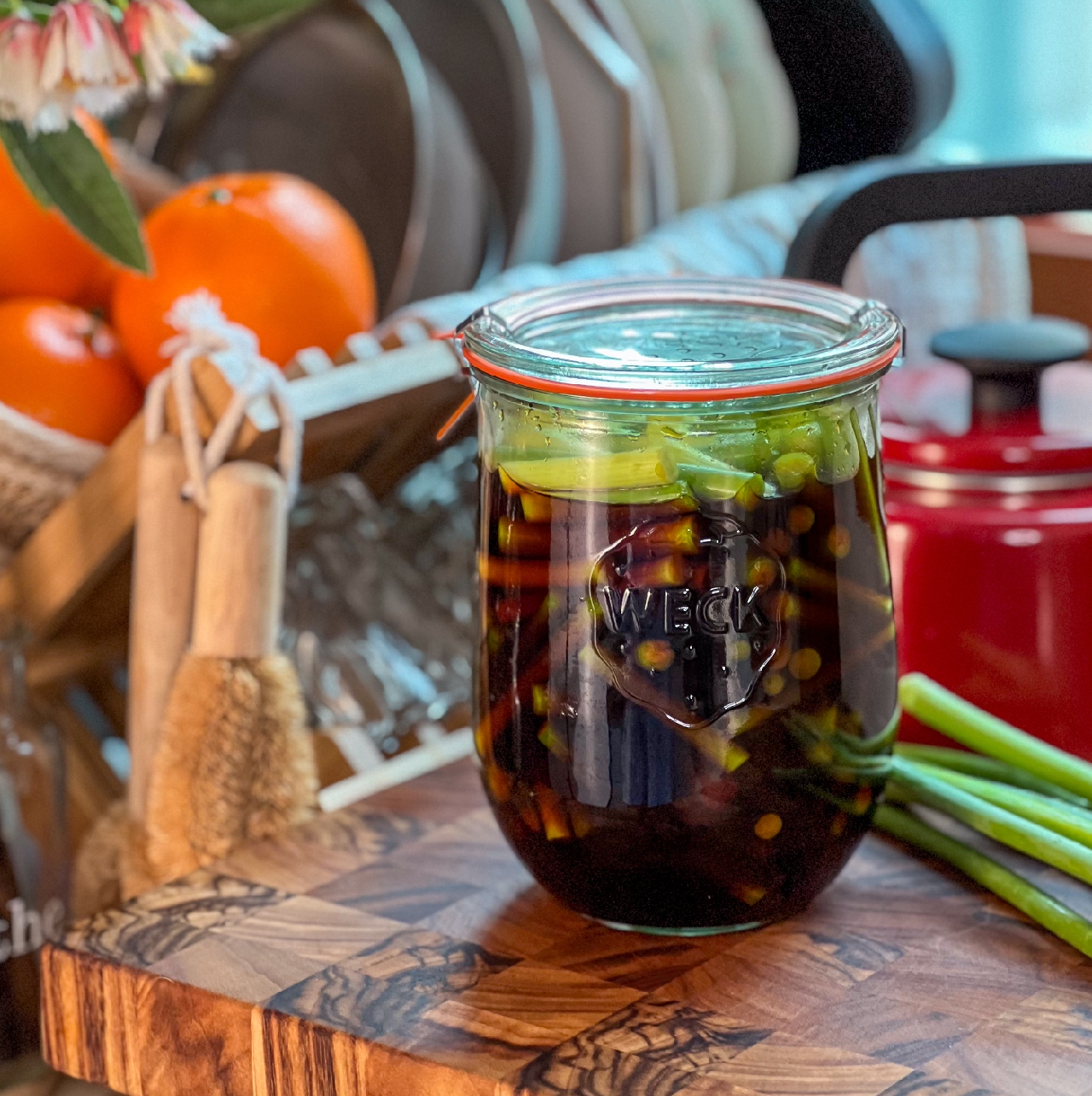 5. 썰어둔 마늘종을 유리용기에 넣고 식은 간장을 넣어 주세요.