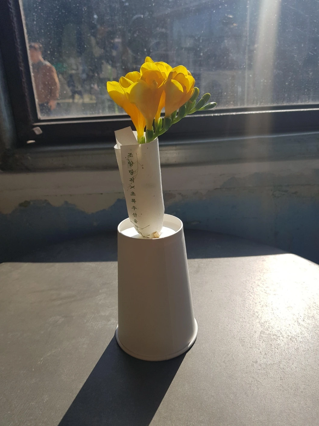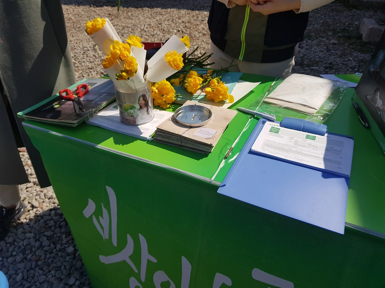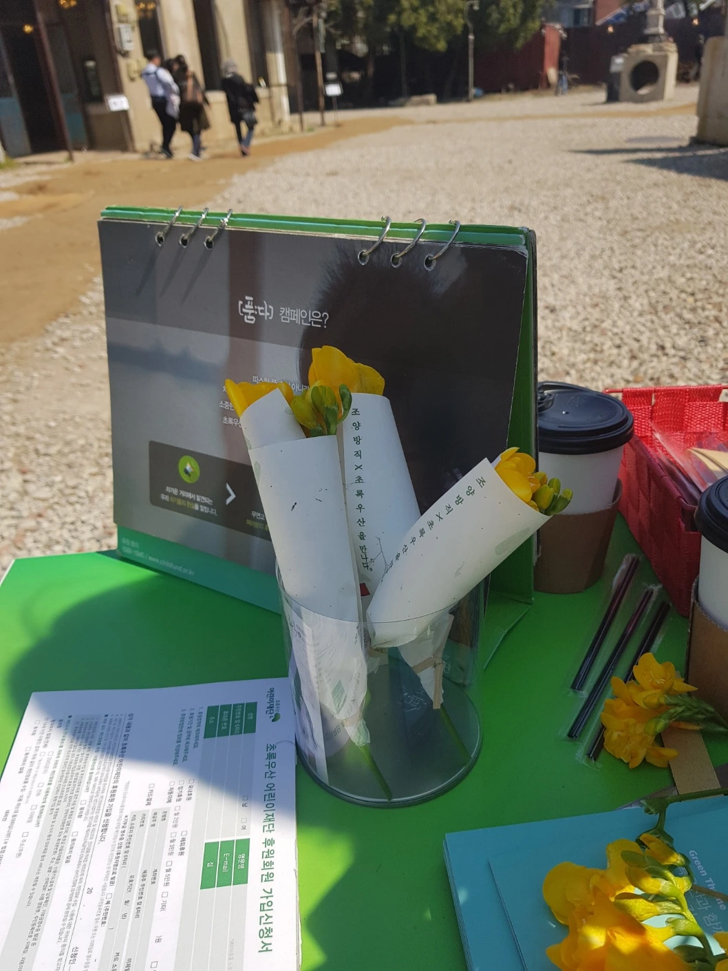 결국 그날 캠페인은 참담한 성적으로 마무리되었다. 3~4개 남짓한 신청서에는 카페 주인도 포함되어 있었다. 오후 내내 우리 근처를 오가며 ‘잘되고 있냐’며 근심스레 묻더니, 끝날 때쯤 다가와 ‘볼펜 하나 달라’며 쿨하게 한 장 써주셨다. 사업장 한켠을 내주고도 마음이 쓰였을 주인에게 감사의 마음을 담아 남은 꽃 몇 송이를 건네고 패잔병으로 복귀했다.