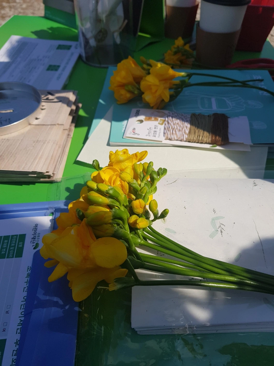 구름 한 점에 미세먼지마저 없던 4월의 하늘이다. 오랜 세월 거리에서 바깥바람을 맞은 캠페인 배너와 테이블, 수천 명의 가망 후원자들이 앉았다 일어났을 포장마차식 의자, 손때묻어 너덜너덜해진 캠페인 책자들은 낡고 허름했다. 그래서인지 시작부터 지쳐 보였다. 마치 우리 마음처럼. 거리 캠페인은 수백 번의 거절을 경험하는 일이다. 재단 로고로 전체가 래핑 된 구식 모닝에 재단 조끼를 입고 앉은 우리의 마음은 어쩔 수 없이 무거웠다. 카페로 향하기 전 꽃집에 들러 프리지아 한 다발을 샀다. 평소 모객용 오퍼로 쓰던 색색깔의 팔찌 대신 꽃을 사용하기로 했다. 형형한 생기를 내뿜는 생화 한 다발 덕에 기분이 좋아졌다. 캠페인 물품에 베인 먼지 냄새 대신 프리지아의 향기를 맡으며 잠시나마 봄을 느끼며 기운을 냈다.