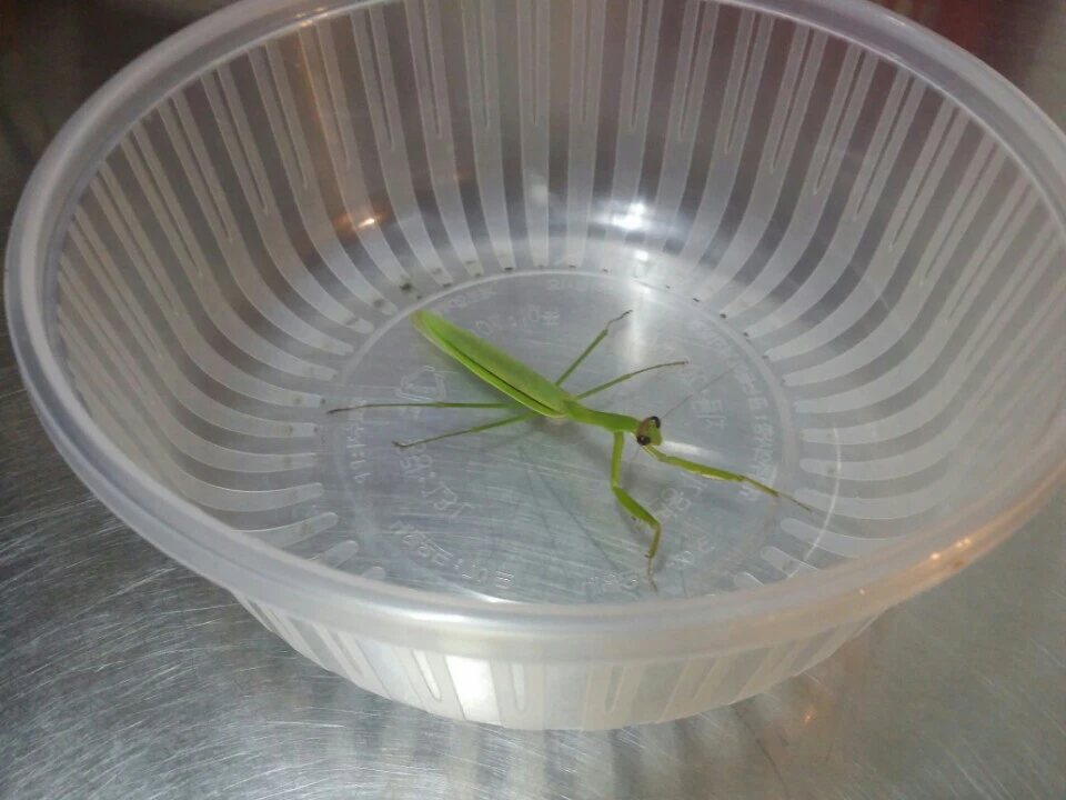 다음날 와서 보니 작은 플라스틱 용기에 풀 몇 개와 초록 사마귀를 같이 넣어 놓고 랩으로 싸서 구멍을 뽕뽕 뚫어서 잡아놨다. 잔뜩 겁먹은 것처럼 내가 그릇을 살짝만 건드려도 엄청 예민하게 반응했다.