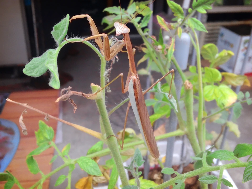 초록 사마귀는 딱 봐도 조조랑은 종이 달라 보였다. 몸이 훨씬 작았고, 얼굴형(?)도 달랐다. 얼굴형에 대해 뭘 알겠냐만은, 그냥 딱 보면 다르게 생겼다. 마치 동양인과 서양인의 생김새가 다른 게 그냥 보면 보이듯이.. 그럼에도 불구하고 나는 조조가 있는 작은 텃밭에 초록 사마귀를 풀어줬다. 서로가 서로를 잡아먹는 일이 없도록 조조는 토마토 나무를 거처로 삼아주고, 초록 사마귀는 고추나무를 거처로 삼아줬다. 애들이 참 착해서 내가 올려준 곳에서 움직이지 않고 얌전히 붙어있었다.