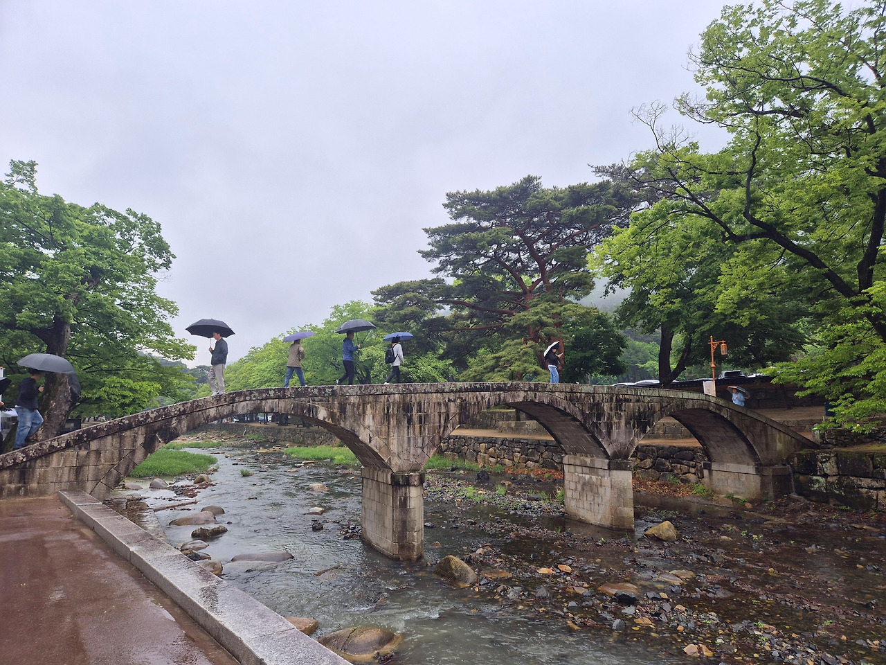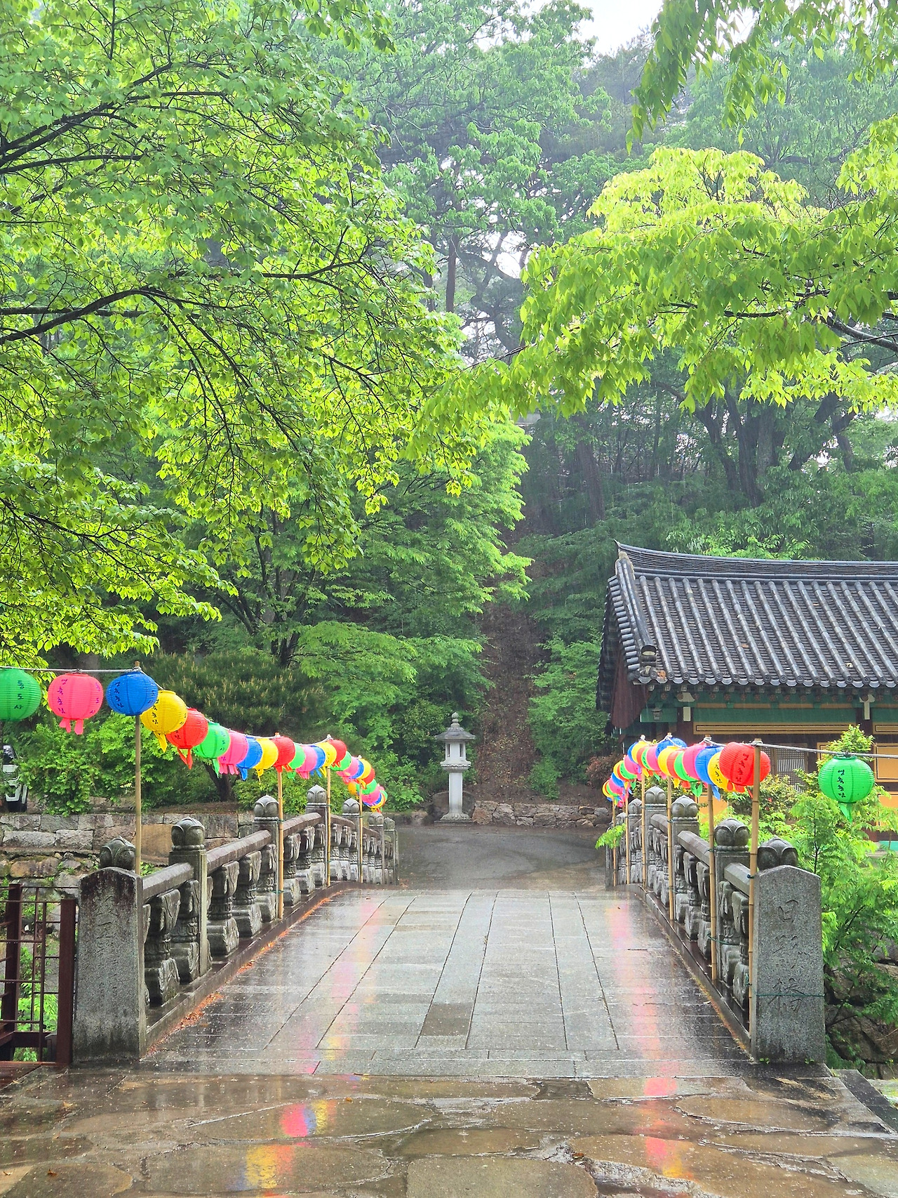 온돌의 훈기가 몸을 가득 채울 때쯤 방을 나셨다. 주변을 산책한 뒤, 차로 5분 거리의 통도사로 향했다. 마침 부처님 오신 날을 앞두고 있어 사찰 안은 준비로 분주했다. 입구부터 압도적인 위용. 괜히 해인사, 송광사와 함께 3대 사찰이라 불리는 게 아니었다. 통도사는 유네스코 세계유산으로 등재된 사찰로, 부처님의 진신사리를 모신 금강계단이 중심이다. 그래서 법당에는 불상이 없다. 비가 오는 날임에도 사찰을 걷는 경험은 불편함보다 운치가 앞섰다.