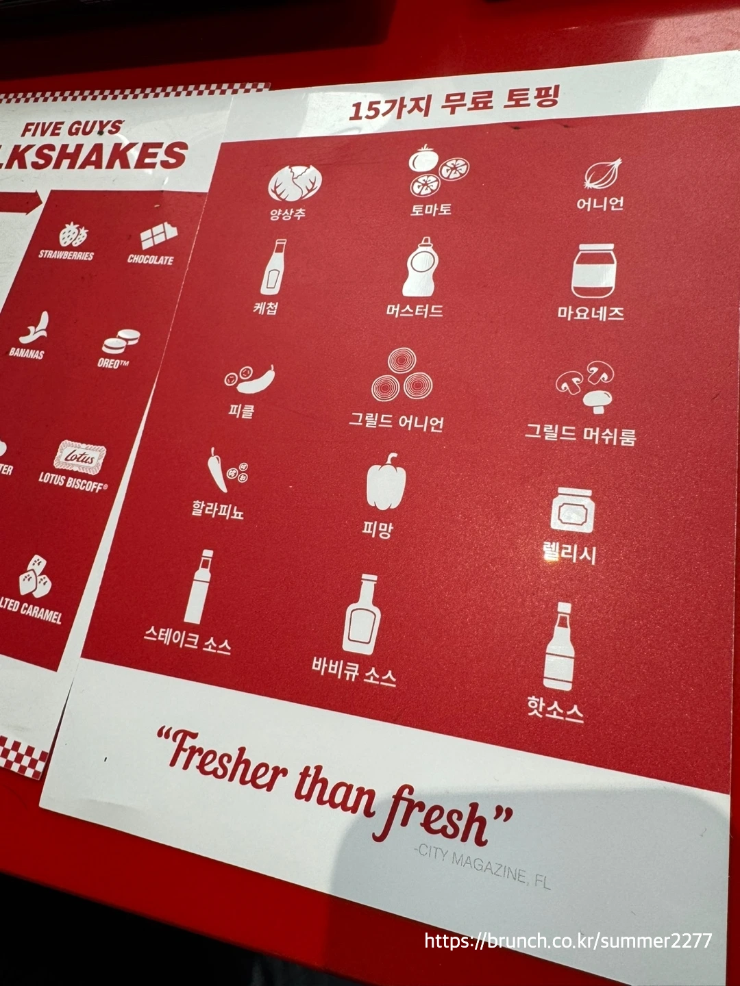 나의 경우, '올 더 웨이' 토핑을 기본적으로 선택하지만, '올 더 웨이'에 포함되어 있는 케찹 소스는 빼고, 스테이크 소스로 바꾼다. 파이브가이즈 버거는 고기 맛으로 먹는 버거라, 케찹보다는 스테이크 소스랑 먹을 때 풍미가 높아진다. 거기에 평소에 추가하던 할라피뇨는 제외하고 생양파와 랠리시를 추가하여 달짝지근하고 신선한 맛을 가미해보았다.