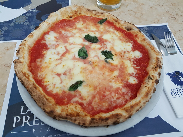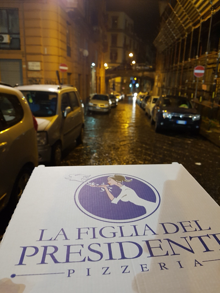 나폴리에 도착한 첫날. 짐을 풀자마자 다시 집밖으로 나왔다. 아무리 비가 와도 나폴리 피자를 포기할 수 없지. 우리의 첫번째 피자는, 대통령의 딸이라는 거창한 이름을 가진 핏제리아집이다. 좁은 입구와 달리 지하로 내려가니 꽤 넓은 공간이 있었는데, 벽돌로 둥그렇게 꾸며놓은 입구가 마치 화덕 속으로 들어가 피자를 먹는 기분이 들었다. 나는 버섯과 햄, 올리브가 든 카프리로쏘 피자를, 남편은 기본이 되는 마르게리따 피자를 주문했다.