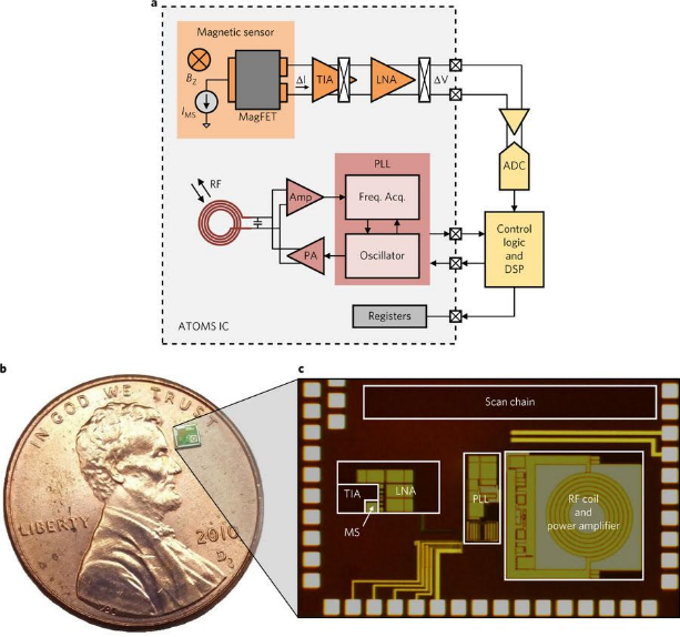 연구진이 개발한 기술은 '아톰스(ATOMS·addressable transmitters operated as magnetic spins)'라고 불린다. '자기 스핀으로 작동되는 송신기'라는 의미로 환자의 몸속에 있는 원자를 관찰하는 '자기 공명 영상장치(MRI)'의 기술을 본 따 만들었다. 아톰스는 자기장을 갖고 있는데 무선 전송기와 센서뿐 아니라 원자의 공명을 모방할 수 있는 기술을 갖고 있다. MRI는 자기장을 발생하는 기기 안에 사람을 넣고 고주파를 발생시킨다. 이 고주파가 몸속에 있는 수소의 원자핵을 흔들게 되는데(공명) 이때 나오는 신호를 분석하면 X선이나 CT보다 상당히 자세히 몸속 상황을 살펴볼 수 있다. 연구진은 "MRI의 핵심은 몸속 서로 다른 위치에 있는 원자에서 발생하는 자기장의 진동수를 분석하는 것"이라고 말했다. 아톰스는 서로 다른 자기장에서, 다른 진동수를 내뿜을 수 있다. 연구진은 아톰스를 쥐의 체내에 넣고 위치를 파악하는 데 성공했다.