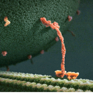 머리로 걷는다고 하지만 여기에 ATP라는 분자가 붙으면 키네신 머리가 바닥에 착 달라붙는다. 한 걸음 내딛은 것 같은 모습이다. 그러다가 ATP가 분해돼 떨어지면 머리가 바닥에서 떨어져요. 내딛은 한 걸음을 떼서 옮기는 모습을 연상합니다. 이걸 반복하며 앞으로 전진한다.