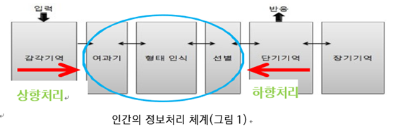 인간의 두뇌가 데이터를 분석하고 처리하는 데 있어 현존하는 어떤 컴퓨팅(computing) 체계보다 우수한 효율성을 가지고 있다는 것은 주지의 사실이다. 인간의 마음(Mind)을 그림 1처럼 정보처리 체계(information processing approach)라는 것에 동의하면, 눈에 보이지 않는 인지(Cognition)도 컴퓨터의 메타포(Metaphor)처럼 처리 가능하며 각각의 단계가 내용(표상)과 처리 조작(계산)으로 정리할 수 있다. [1]