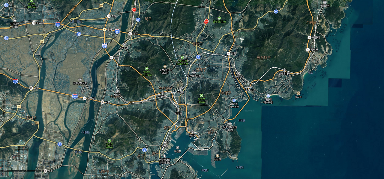 위성지도로 부산의 지형을 보면 산과산 사이에 도시가 형성된것을 알수 있습니다.
