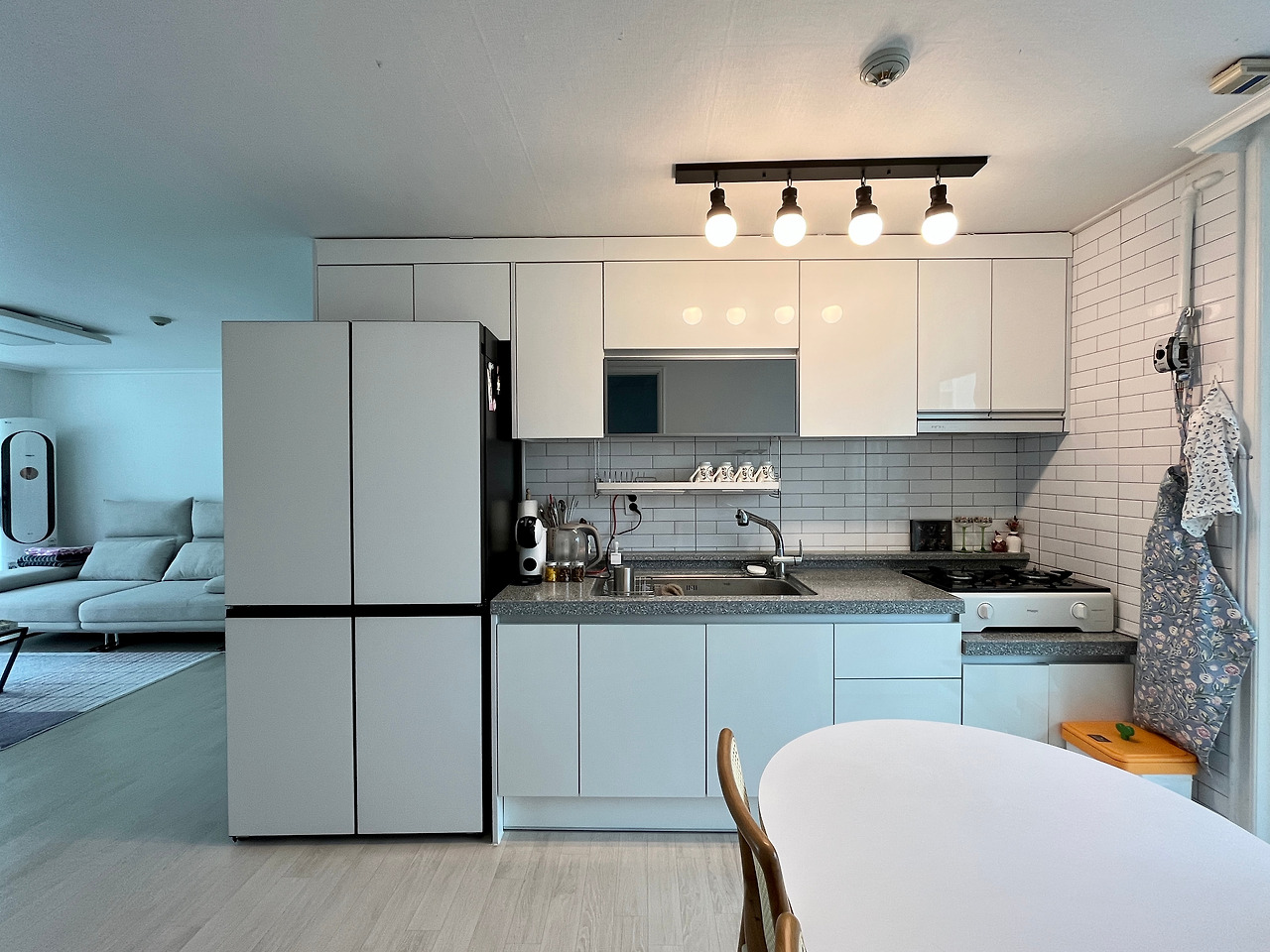냉장고를 지나면 흰색 커튼으로 가려진 공간이 보인다. 세탁기와 건조기가 있는 다용도실이다.