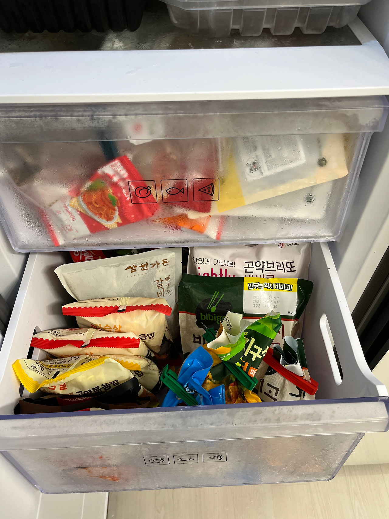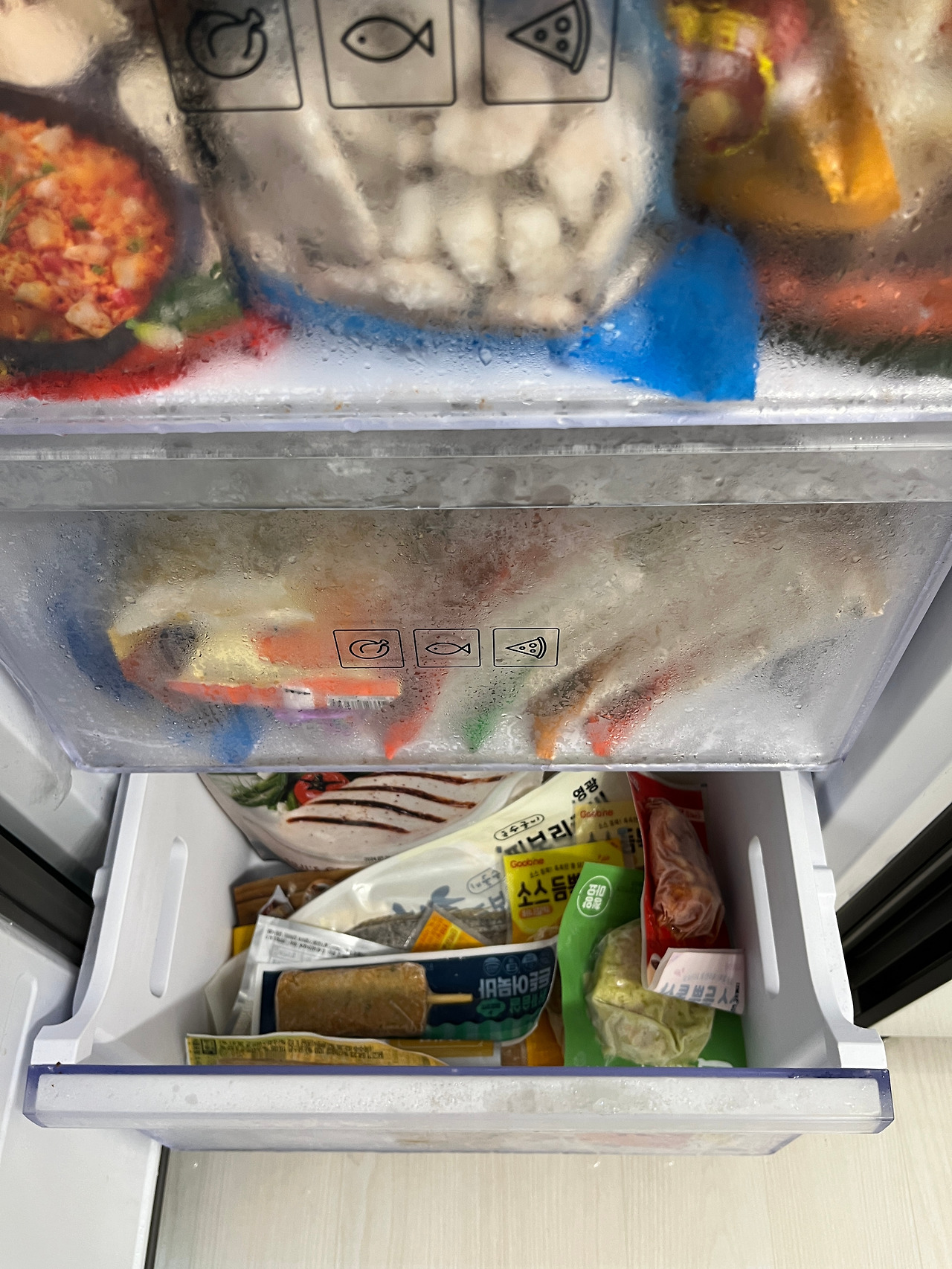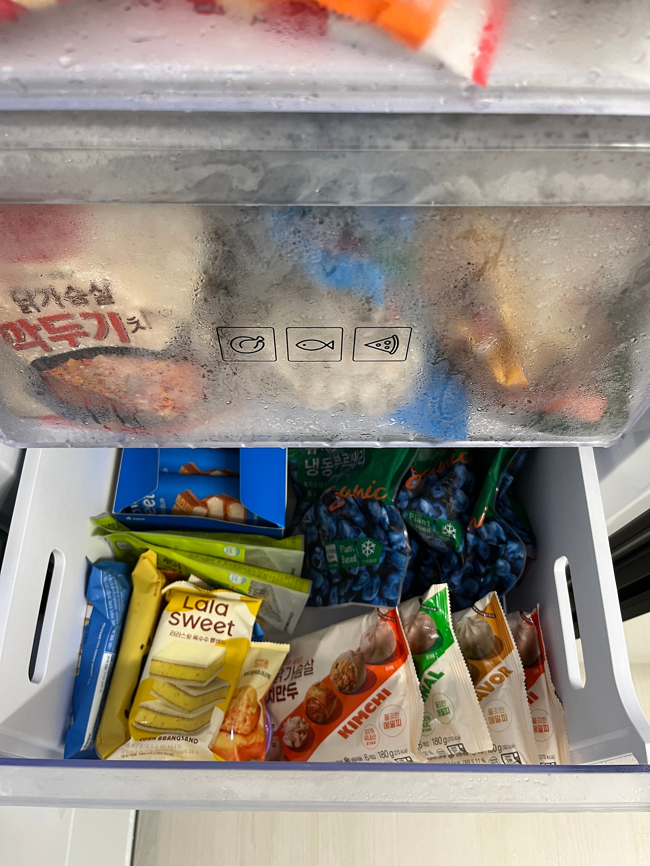 냉동실 첫 번째 칸은 반려견 식품 칸으로, 두 번째 칸은 식사 대용 칸이다. 볶음밥, 부리또, 크로켓, 갈비 등의 냉동식품 칸이고 세 번째 칸은 간식 대용 칸이다. 만두나 아이스크림, 블루베리 등을 정리했다. 마지막 칸은 다이어트에 진심인 동생이 사놓은 각종 닭가슴살 식품 및 굴비 등 생선을 놨다.