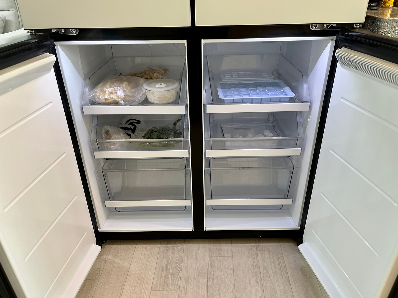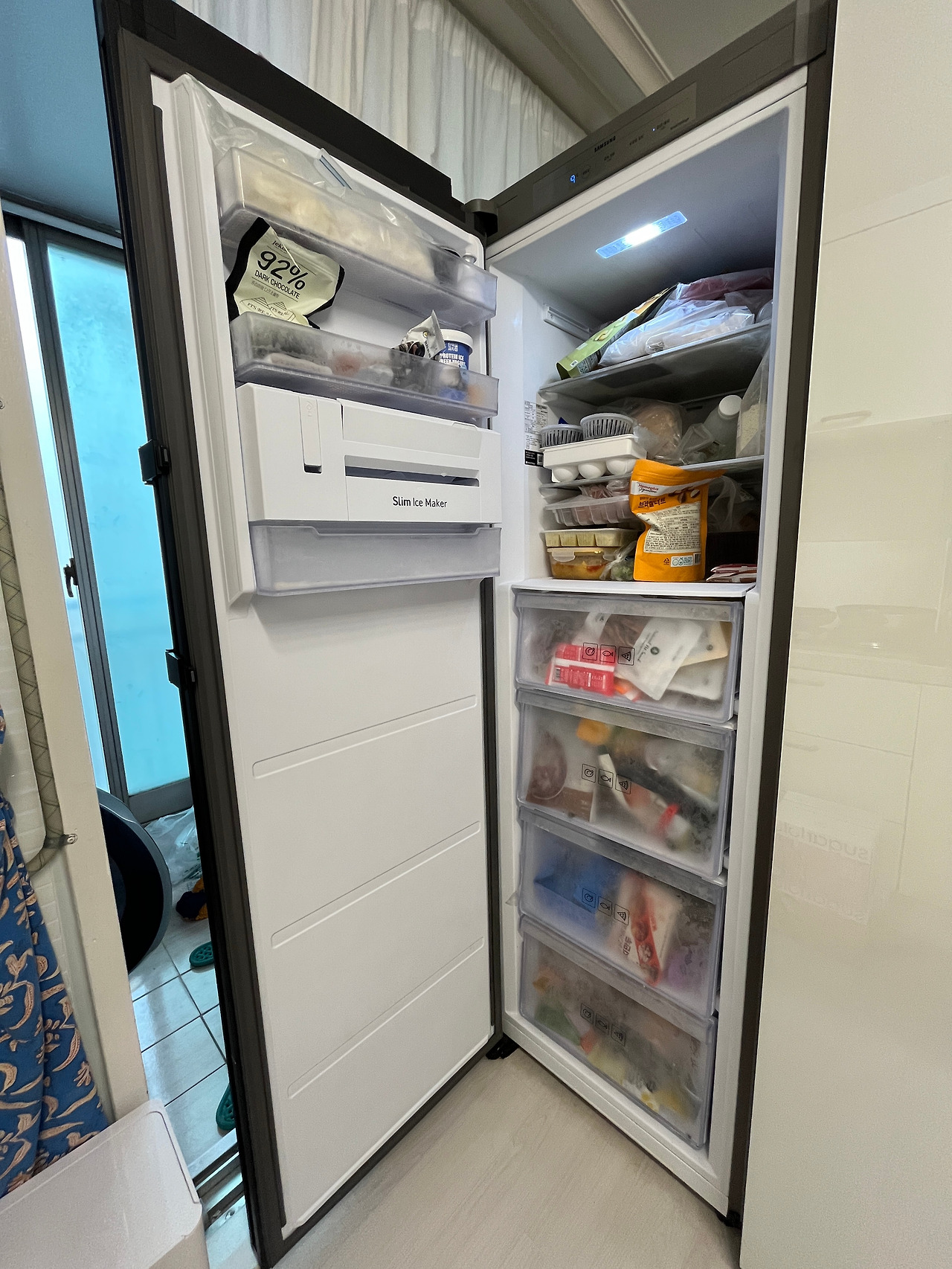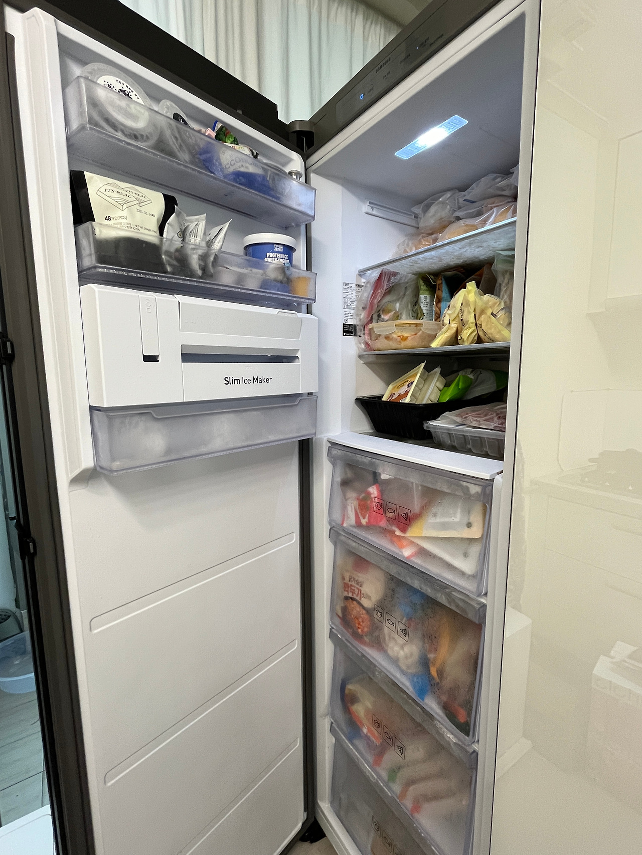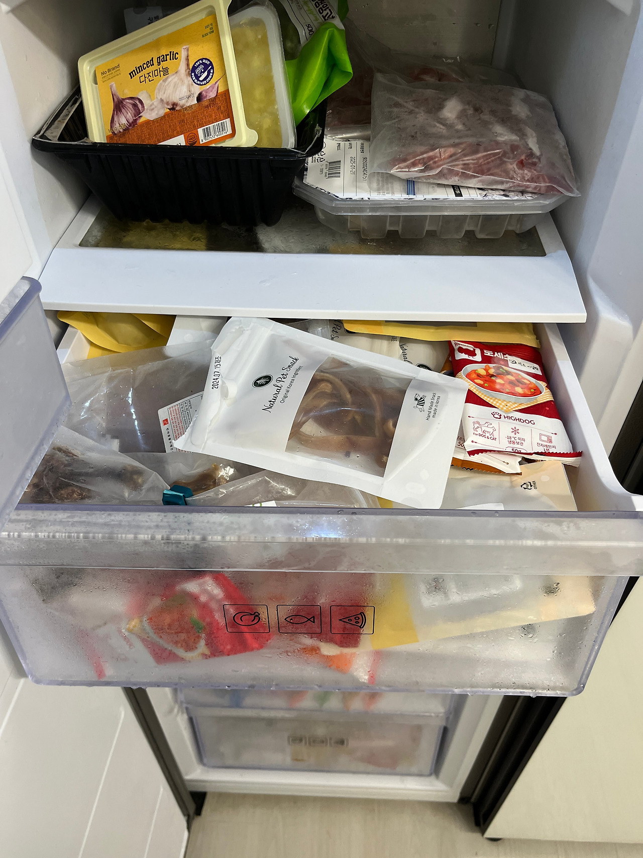 냉동실 첫 번째 칸은 반려견 식품 칸으로, 두 번째 칸은 식사 대용 칸이다. 볶음밥, 부리또, 크로켓, 갈비 등의 냉동식품 칸이고 세 번째 칸은 간식 대용 칸이다. 만두나 아이스크림, 블루베리 등을 정리했다. 마지막 칸은 다이어트에 진심인 동생이 사놓은 각종 닭가슴살 식품 및 굴비 등 생선을 놨다.