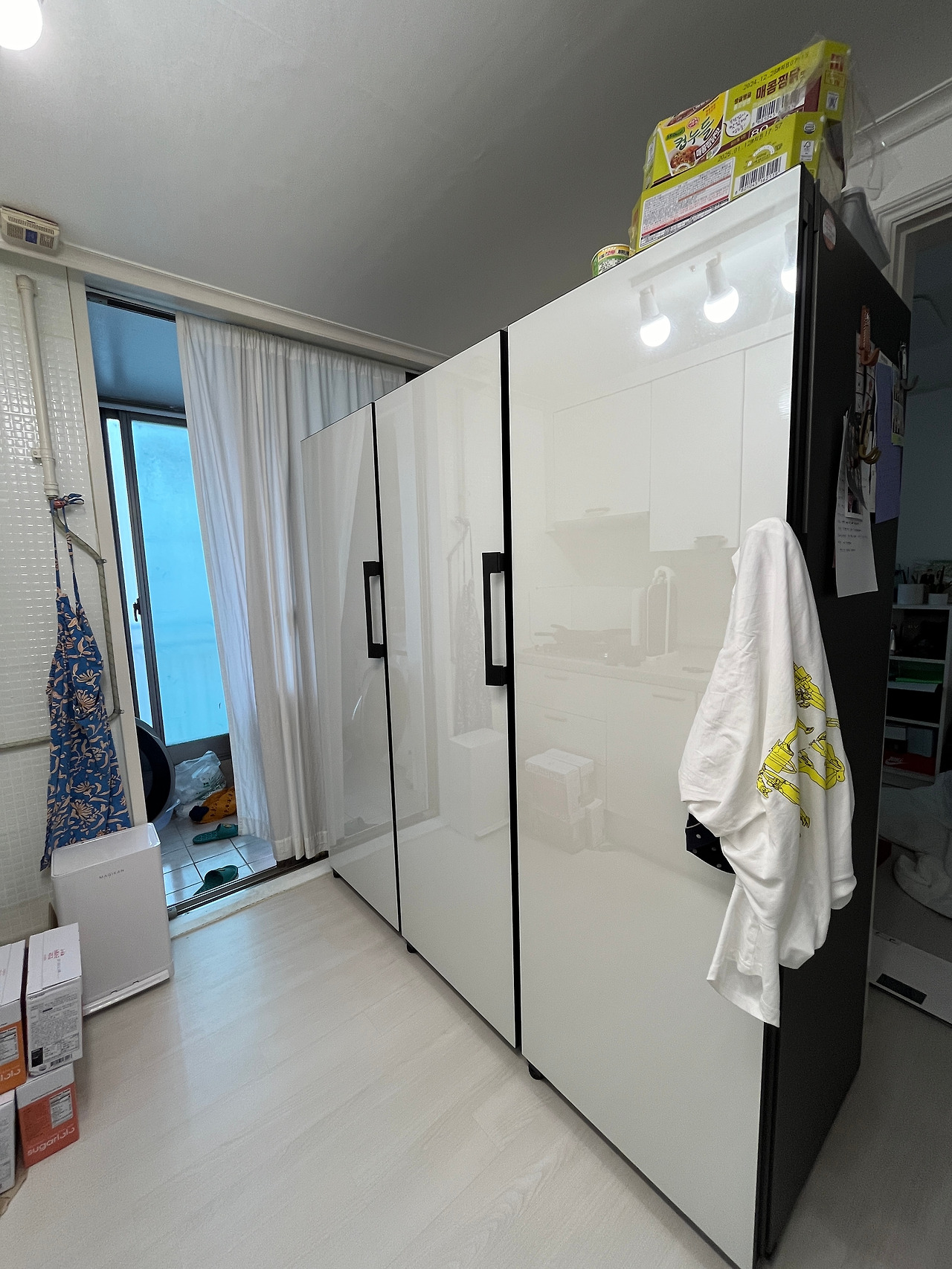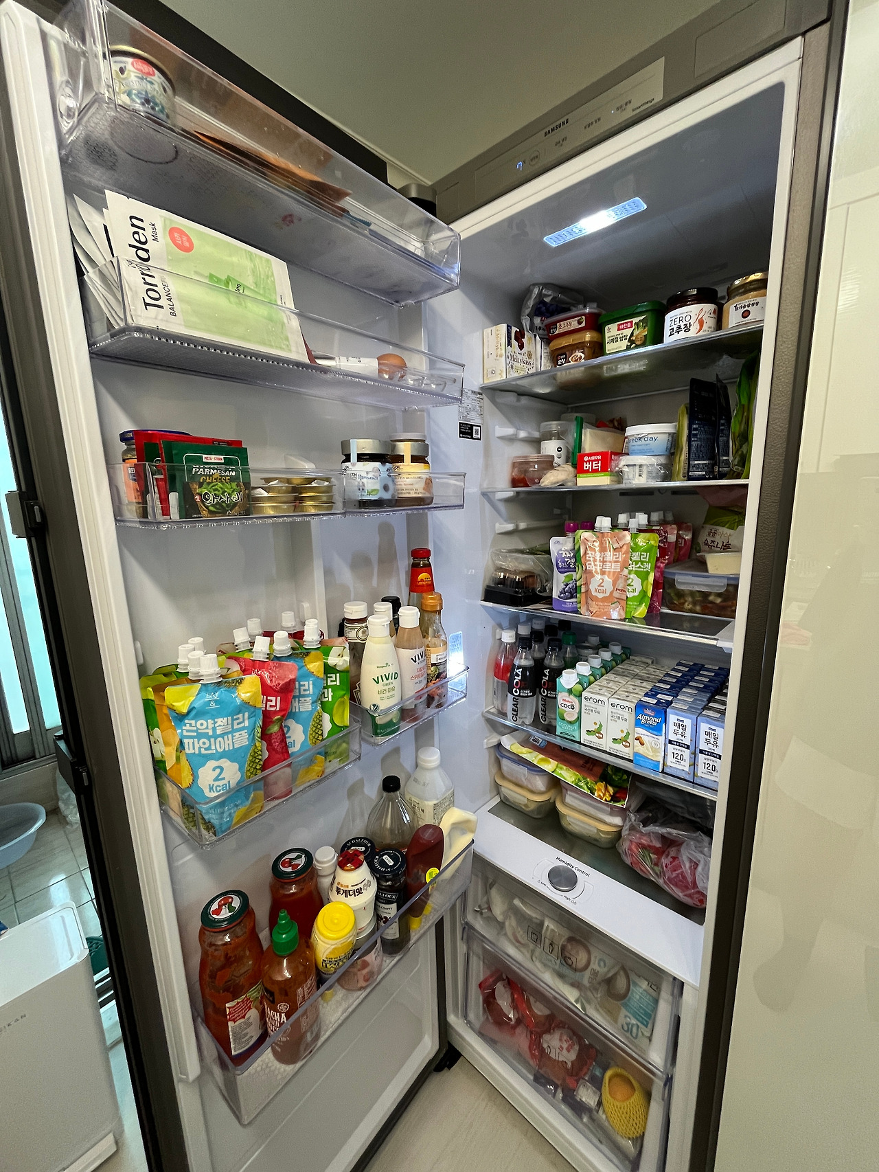 냉장고가 크면 채우려고 하게 되어서 작은 걸 사려고 했지만 엄마의 사랑(집들이 선물)을 막을 수는 없었다.