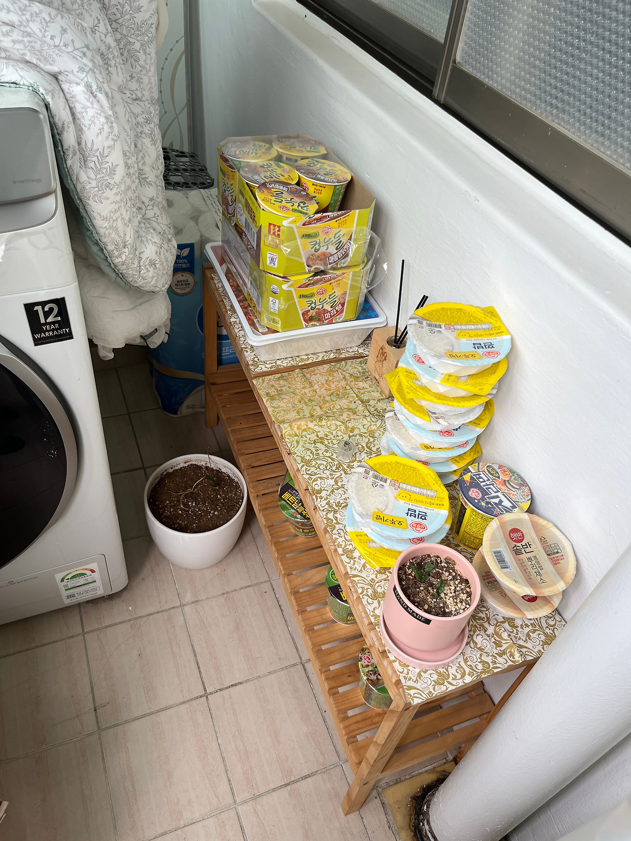 지난번에 한 번 정리해 줘서 이 정도인데 아무튼. 어느새. 화분과 식료품과 세탁시설이 한 데 모여 있는 곳이 되었다.