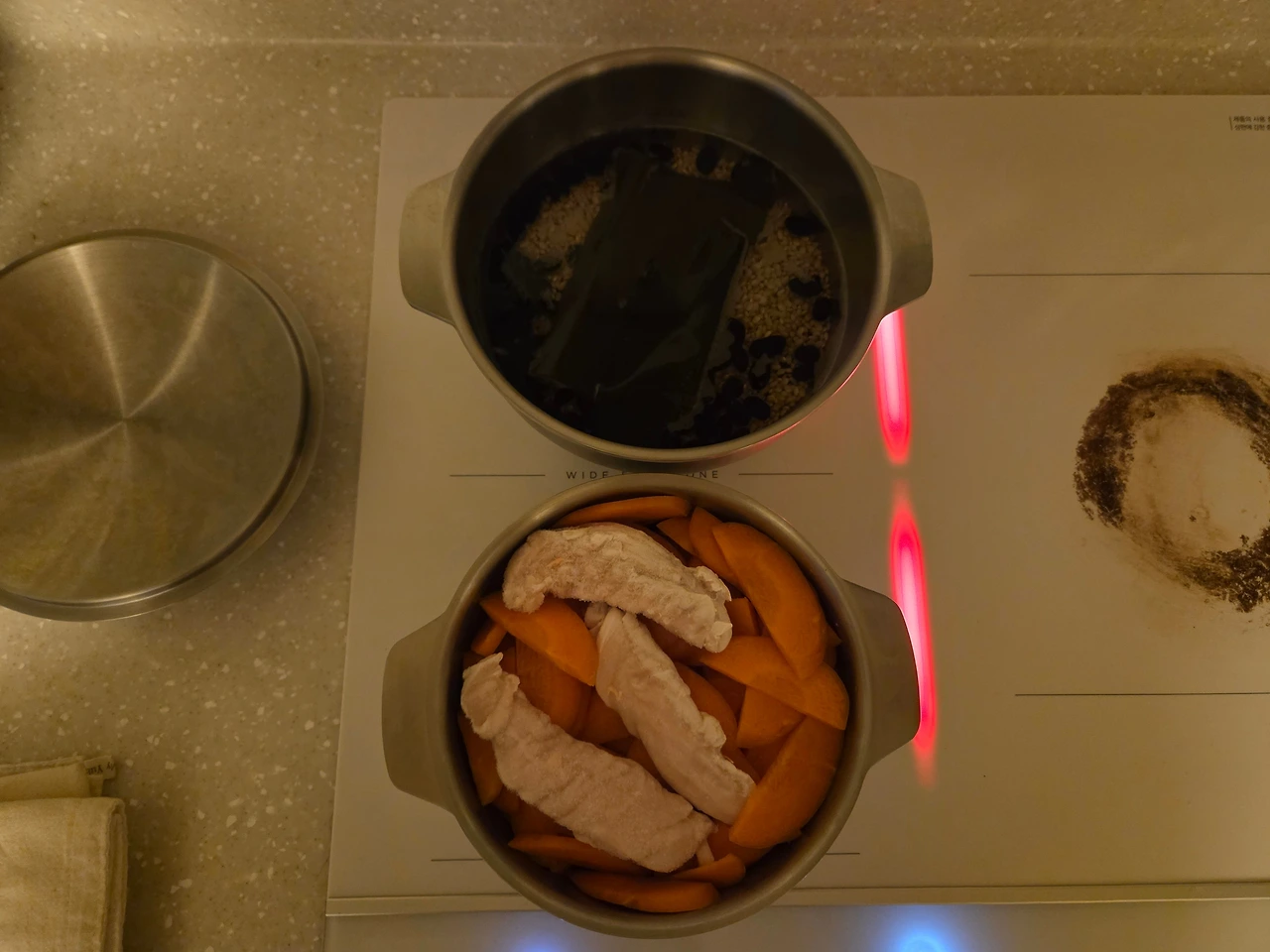 현미밥을 냄비에 안치고 찌는 당근 위에 닭안심도 쪘다. 이 냄비로 현미밥을 처음 해 보았다. 통 5중이어서 무쇠솥과 같을 줄 알았는데 현미가 푹 익지 않고 낱알이 설컹설컹 씹혔다. 하던 대로 현미밥은 무쇠솥에 하기로 한다.