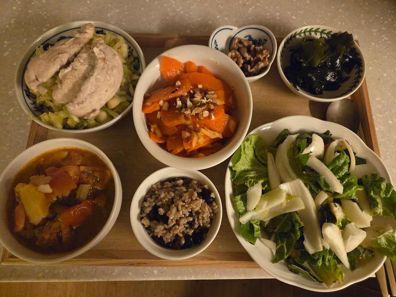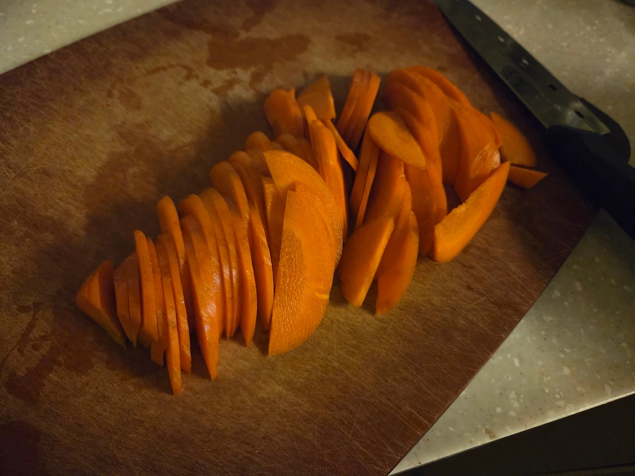 당근을 어슷 썰어 찜기에 올려 쪘다. 어슷 써는 게 포인트라고 했다. 쪄서 무치는 당근을 처음 만들어보며 찌는 시간을 생각 못하고 오래 찐 거 같다. 그래도 양념에 버무려 씹는 맛있게 맛있게 먹었다. 양념은 다진 양파, 올리브오일, 고춧가루, 레몬즙, 소금, 후추. 대체식품으로 고춧가루를 사용해도 된다고 해서 넣어봤는데 괜찮았다. 레몬제스트를 넣어 식당에서 먹는 맛이 된다고 했다. 제스트를 내기엔 번거로워 대신 레몬즙을 넣었고 그것으로도 집에서 품위 있게 먹는 맛(?) 정도로 충분했다.